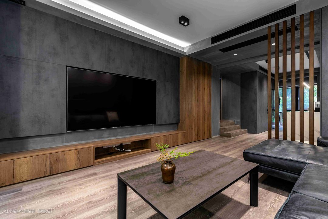 木栅栏的隔断里面是客厅区,水泥墙的电视背景墙体现出工业风的冷冽质感。