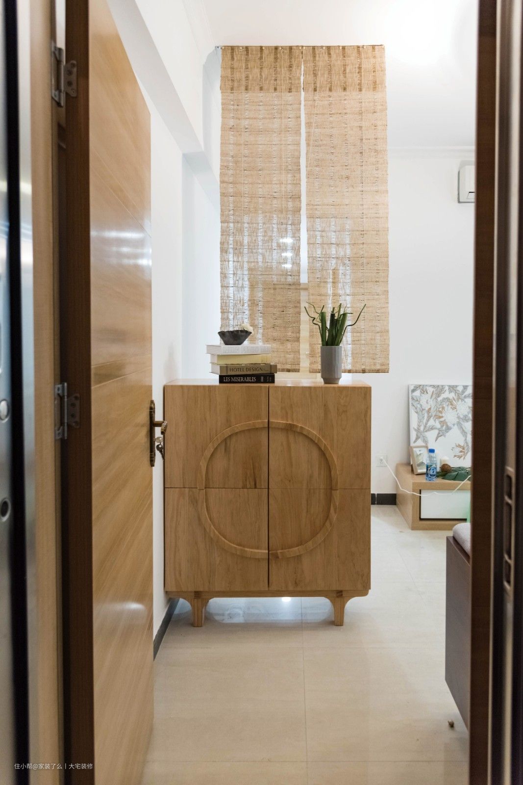 玄关运用木稻卷帘,让空间赋予极致的柔美与细腻的触感,不仅遮挡了外界的视线,划分了空间的区域,也让空间显得更加通透。