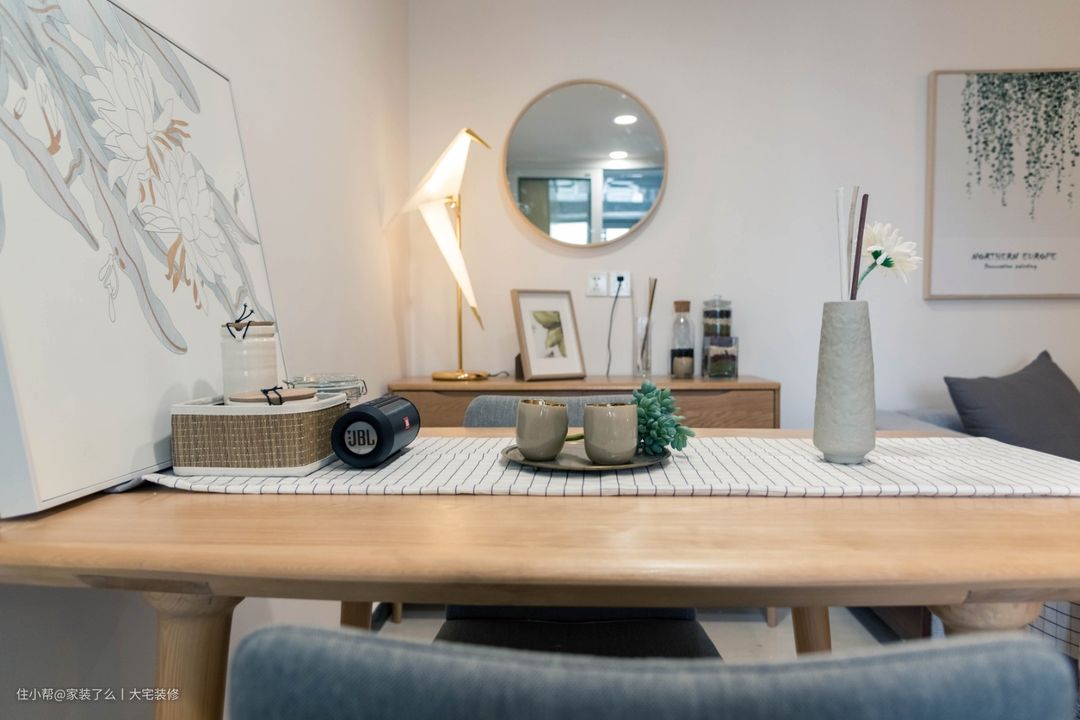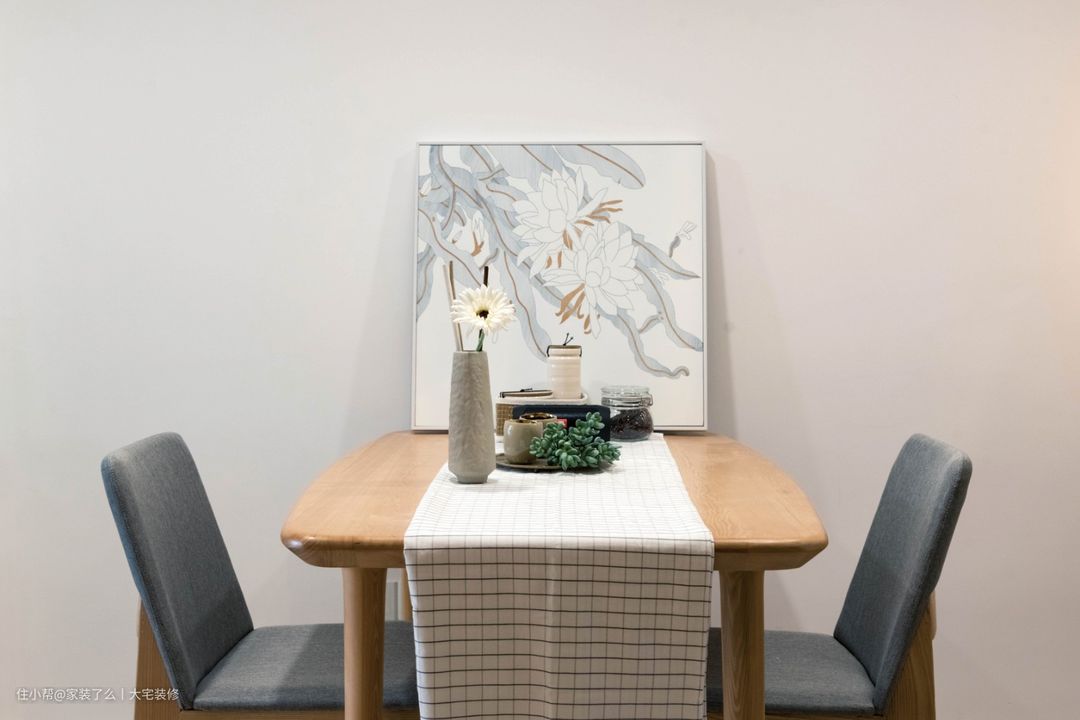 餐厅的设计完美的搭配空间的细腻质感,一张小的餐桌,配上清新淡雅的背景画,空间都显得格外细腻柔和。