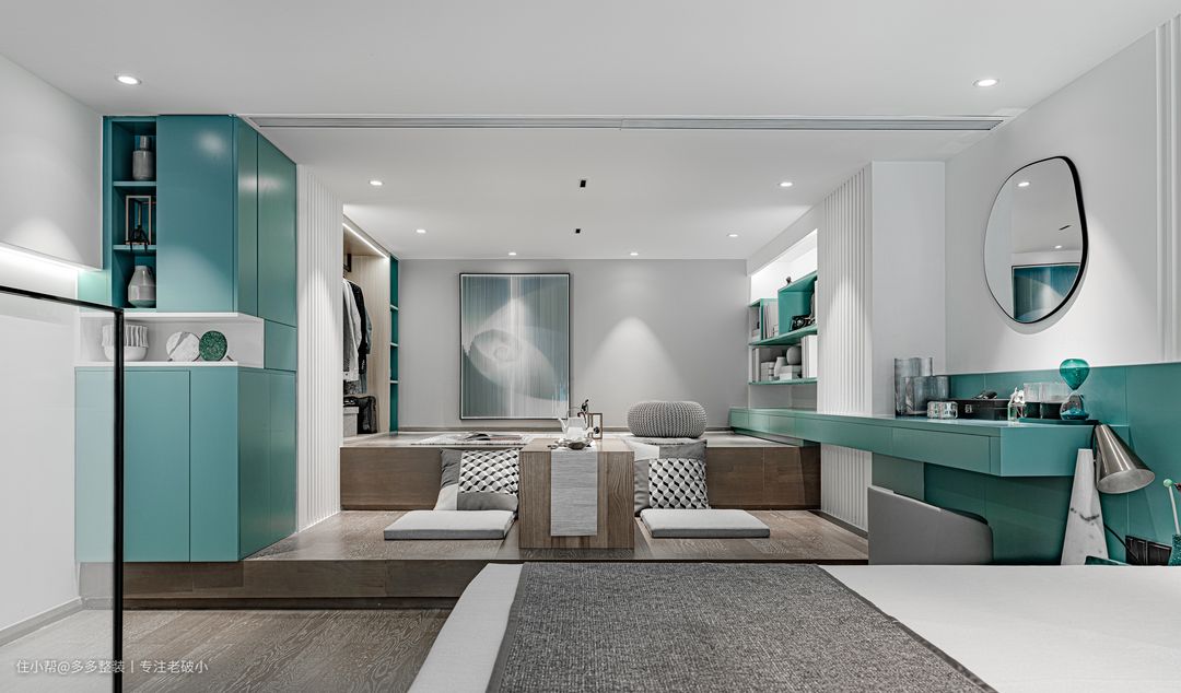 二楼另一侧是收纳空间以及自己的一个休闲空间,左边一体柜的设计从摆,收,放有序的并排,视觉实用连通。右边是镂空柜面设计,放置业主的一些生活用品。中间处是一个休闲区的设计,办公娱乐通用。同时还保证了空间的灯光的气氛和空气的流通性。