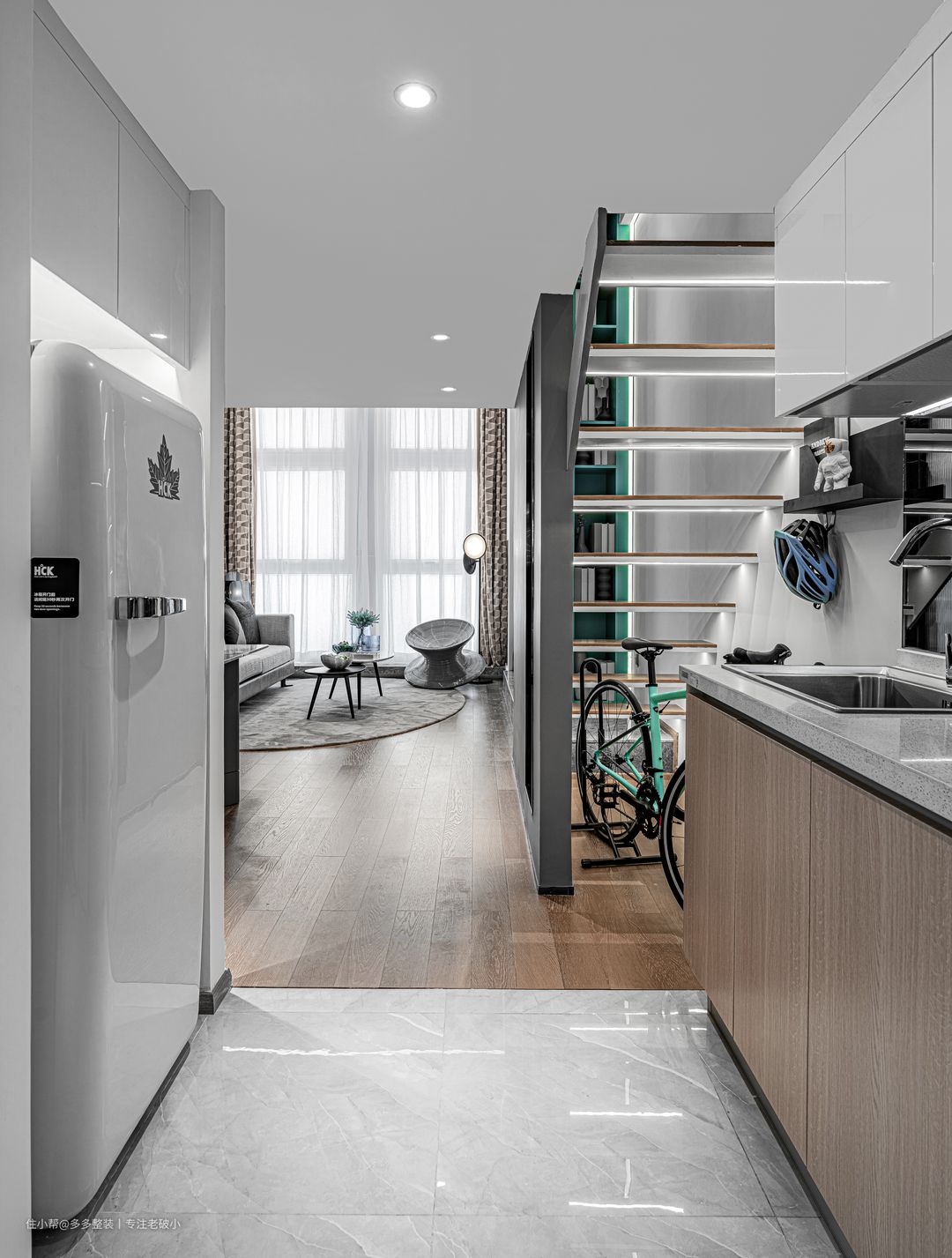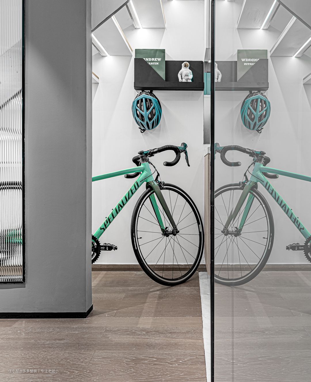 采用楼下狭小的面积设计了一个放置单车的设计,墙面的装饰品挂上安全帽, 满足于业主要求收纳爱车的喜好。