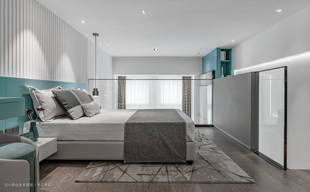 Loft二楼,扩张区域,轻松腾出超大主卧。主卧1.8米的床,且柔软无比,围栏采用玻璃式,空间整体简约大方,更注重睡眠质量,而温馨的空间会有助于安然入眠。