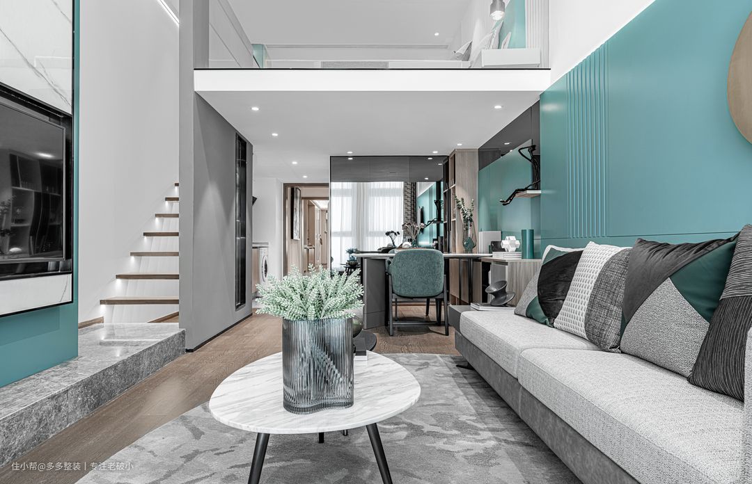 隔层看客厅的视角,白青灰色系的搭配让客厅空间增加了不少文艺气息。