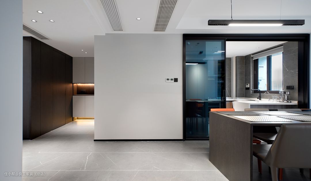 厨房空间采用半开放形式,玻璃大移门,封闭与半开放模式可以随时切换,即使关上移门,也不影响整屋的通透性,烹饪时也能将有效阻隔油烟。