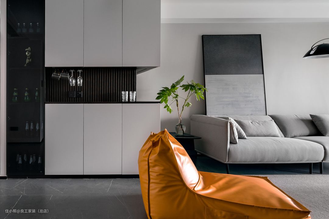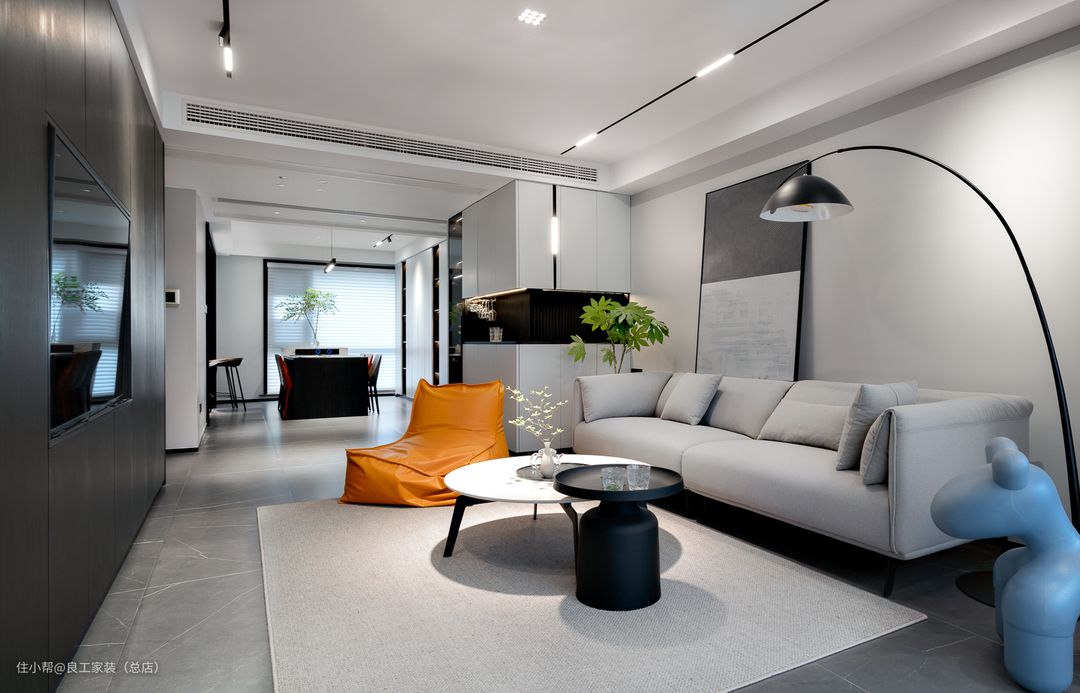 客厅以大面积的白色为主,局部加入灰色与黑色,让空间感由浅及深,丰富层次感。巧妙加入色彩鲜亮的懒人沙发和设计感十足的蓝色造型椅,极大的增强了客厅的灵动性。