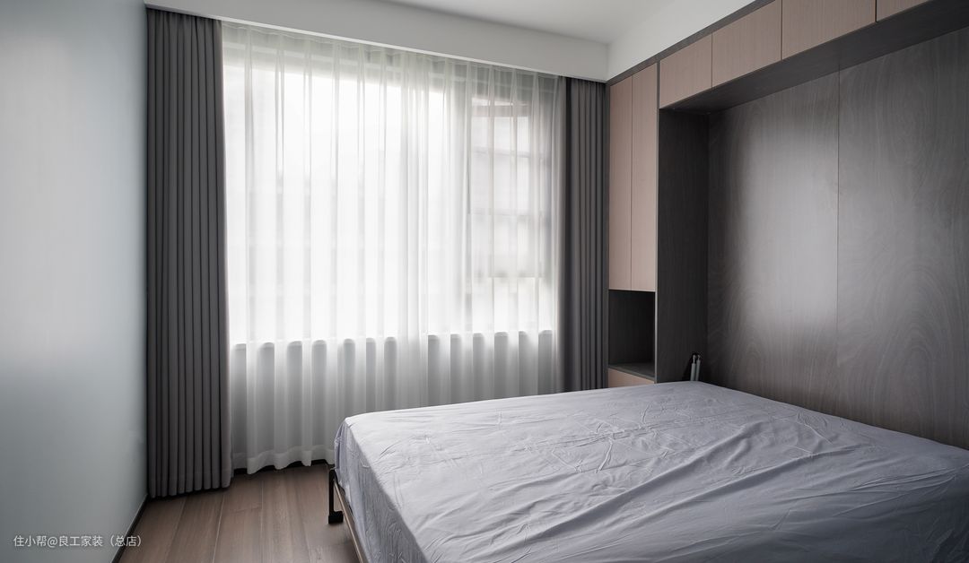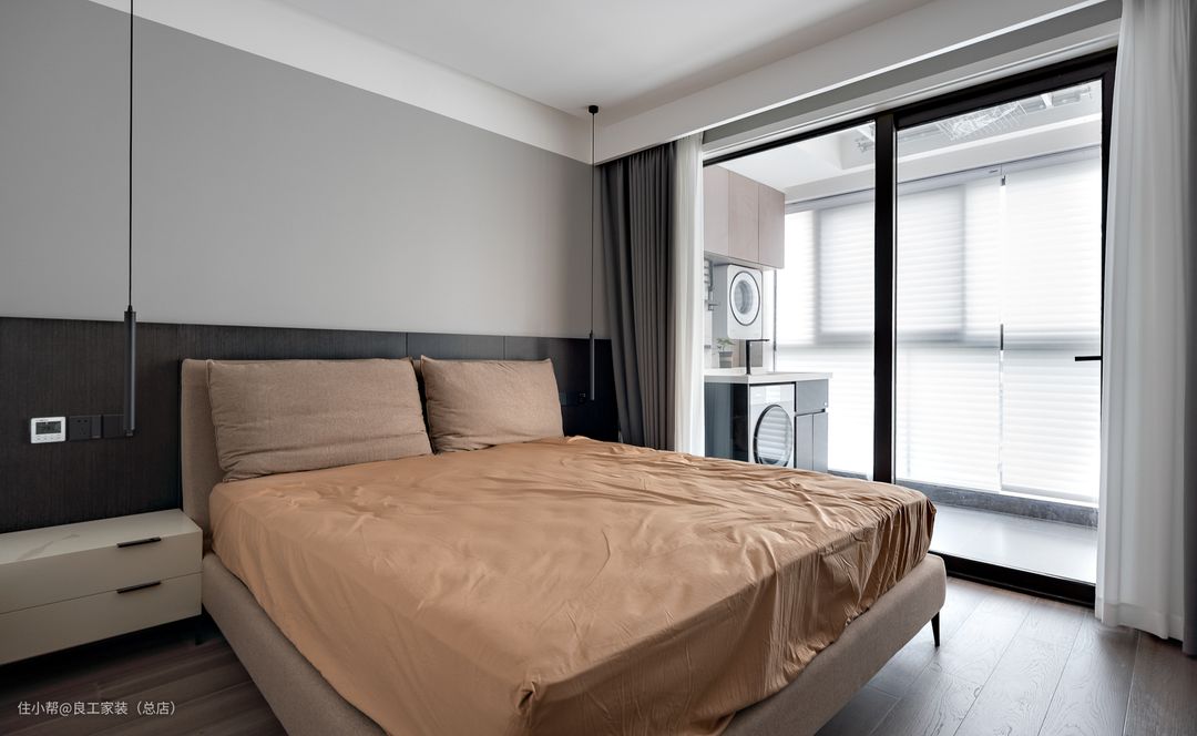 主卧延续客餐厅的简约基调,硬装以灰色系为主,简单、舒适,不加过多装饰。软装选了浅咖色系,两种高级的中性色调进行深浅色组合,营造出一种简约、耐看的空间格调,带来了更多静谧安然的气韵。