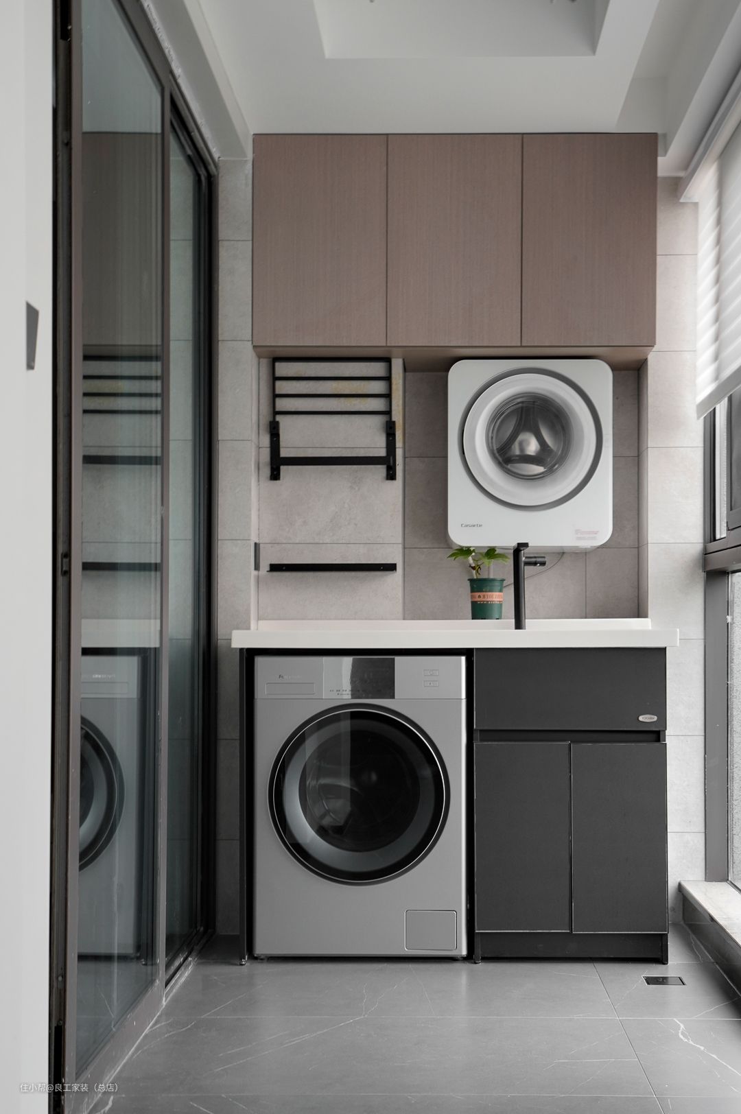 卫生间主打黑白灰,利落有型,时尚有味,不加过多的装饰让收纳整理更加方便,方寸间尽显现代都市摩登气韵。