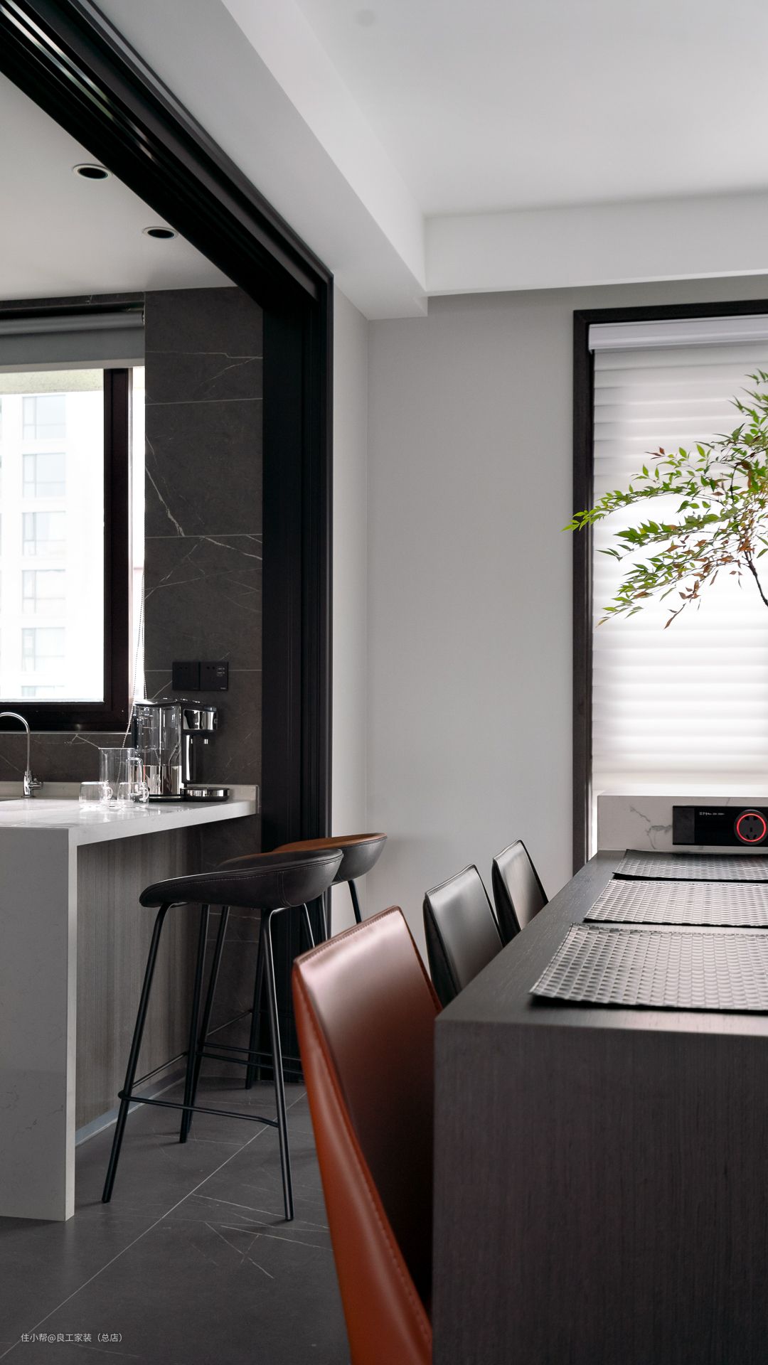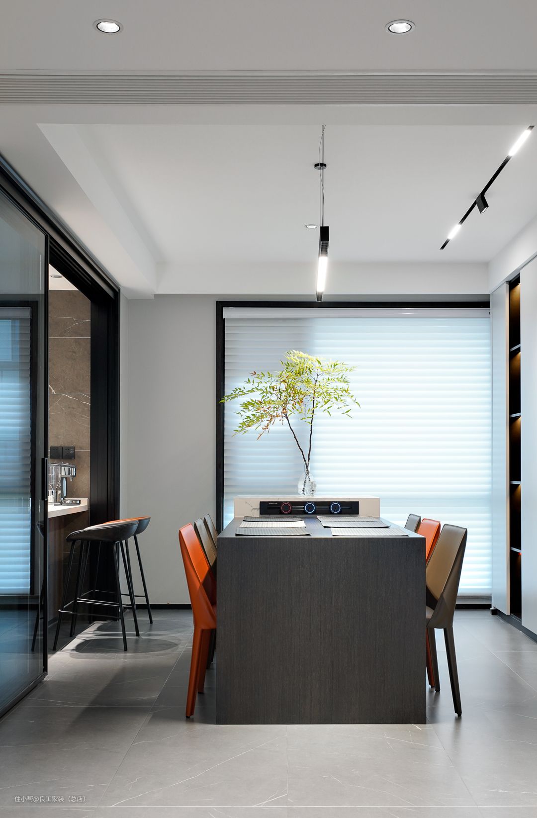 百叶窗为餐厅区域引入了充足的阳光,马醉木的影子疏疏落落洒在桌面上,自然气韵自由穿梭,释放美感与层次。