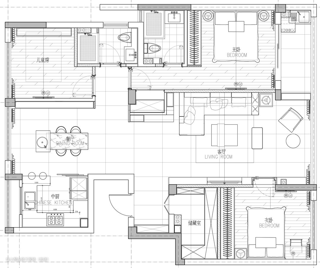 双阳台一直从客厅延到主卧,一半纳入客厅空间后,另一半则留作生活功能阳台使用,避免了只能从主卧进出阳台洗晒的尴尬。