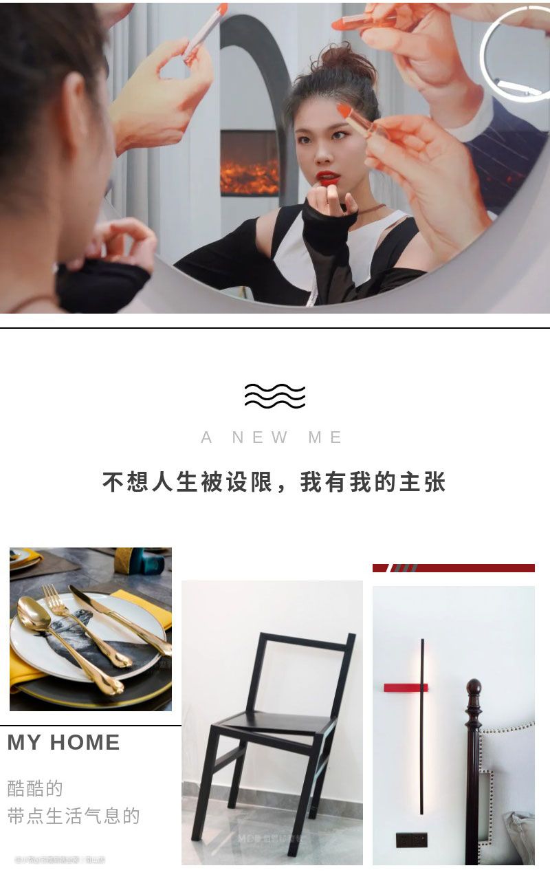 结合自身在家开灶的频率比较少 餐厅这边陈小姐没有选购固定的餐桌 而是选择了这种可折叠式的 闲置时直接收纳起来变身家的装饰品 这面镜子是陈小姐特别满意的地方 在这样的小户型里 它完美地将视觉空间延伸 门状造型如通往时光隧道之门 打开它是另一个新鲜的世界 当然,最最最实用的是 当个落地全身镜也不错