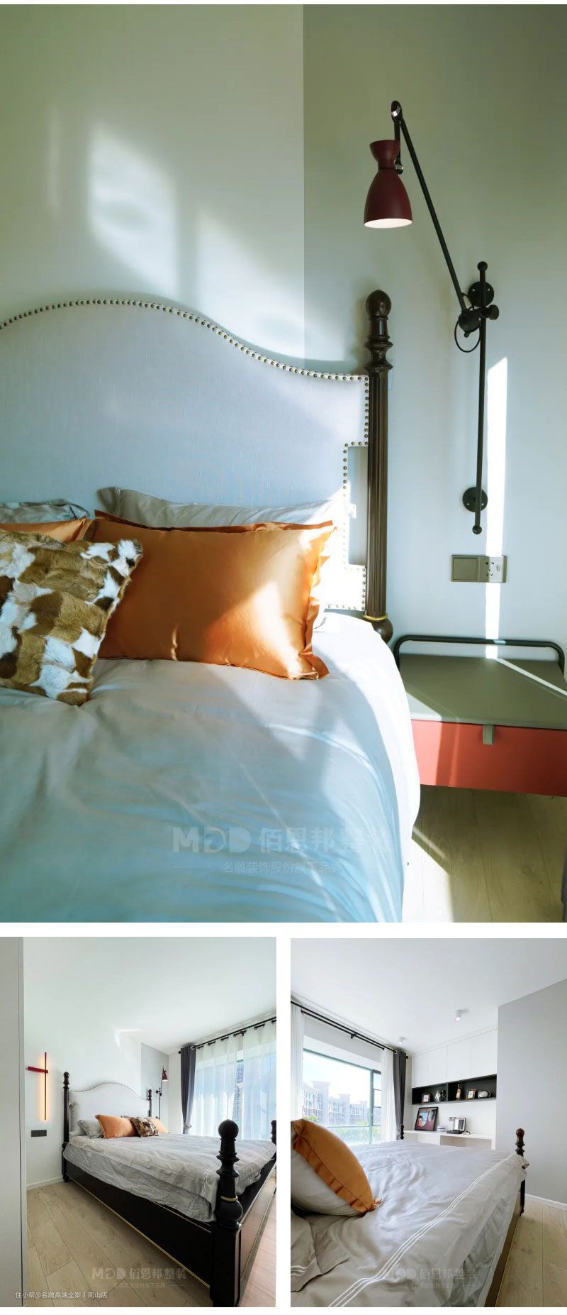 主卧映入眼帘的是这个实木大床 四平八稳,端庄大气 有如一位学识渊博,阅历深广的智者 稳稳地坐镇一方 精心调制的色彩上墙高级耐看 给空间增添了几分层次 阳光肆意闯入屋子 窗外生机勃勃,鸟语花香 享受这份独有的惬意