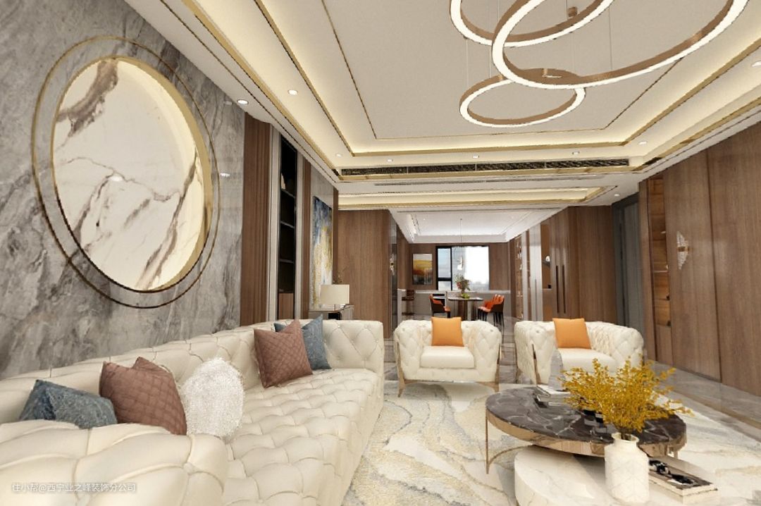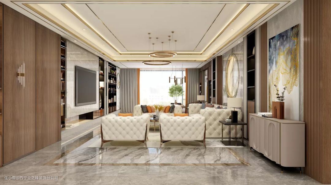 客厅我们讲求美观性,毕竟一进门看到的就是它,以线条和弧线相组合,整体视觉上是温馨的暖色调,加上灰色和棕色调,简约中不失品质,轻奢风和中式风相存,大方简洁,华丽低奢,韵味十足
