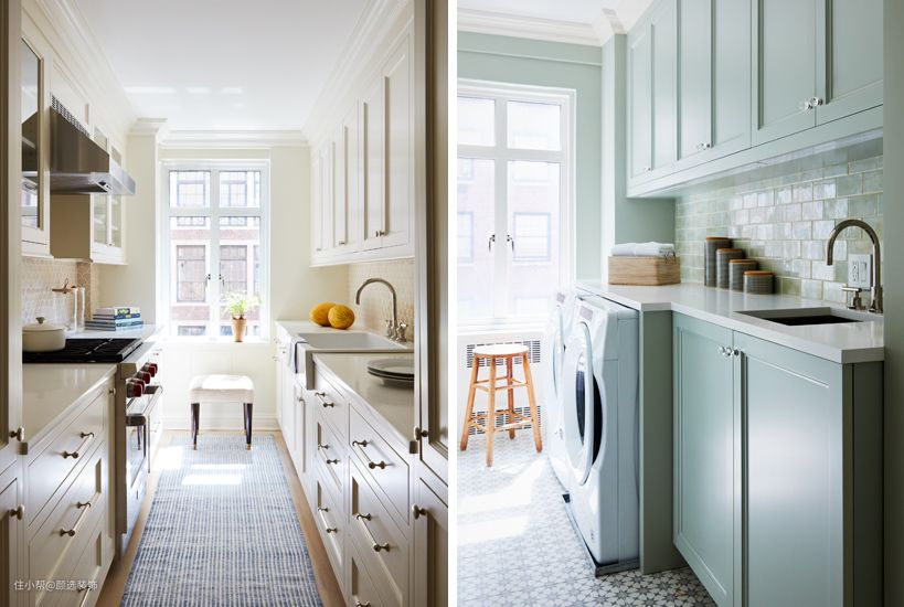 厨房临窗设置,双i型的橱柜,加大了整体的储物空间,大小不一的抽屉满足不同 的储物需求。 生活阳台选用浅绿的储物柜,将洗衣机嵌入,阳光透过了窗户照射到地板上,静静感受生活的惬意。