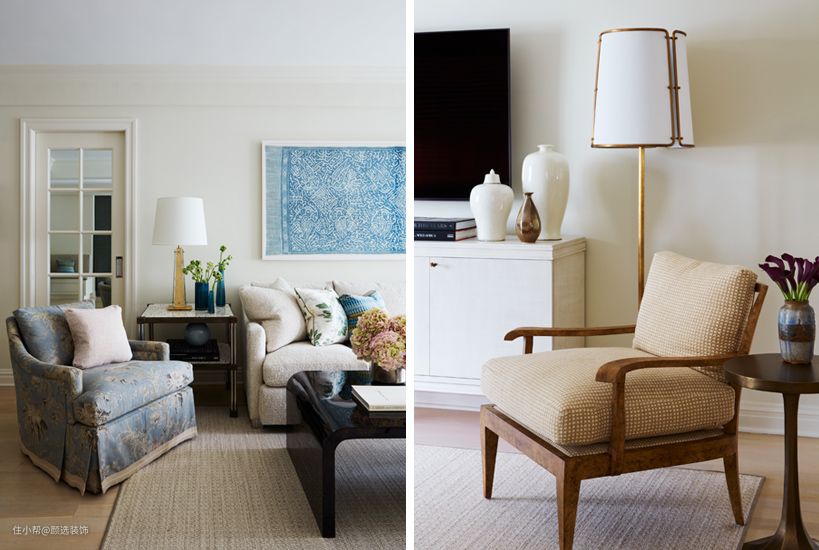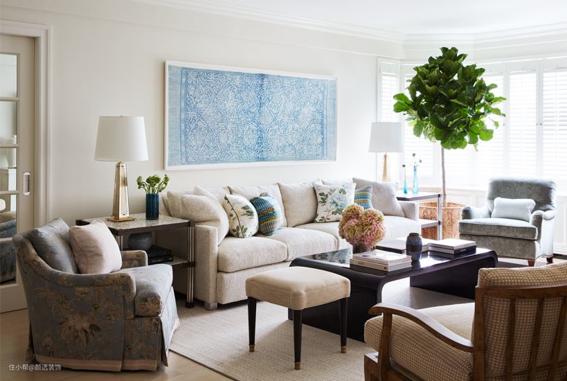 客厅的色调搭配,糯白色中间穿插着少量的亮色,美式经典的蓬蓬沙发让人光看照片就能感受到柔软。温润的气质中又包含着品质体现。一株绿植放在客厅打破安静,活跃了整体的气氛。