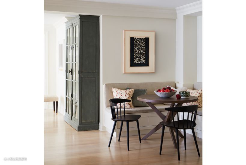 餐厅做L型卡座式,围绕着一张小圆桌而设,深浅不一的色调让空间更加具有层次感。