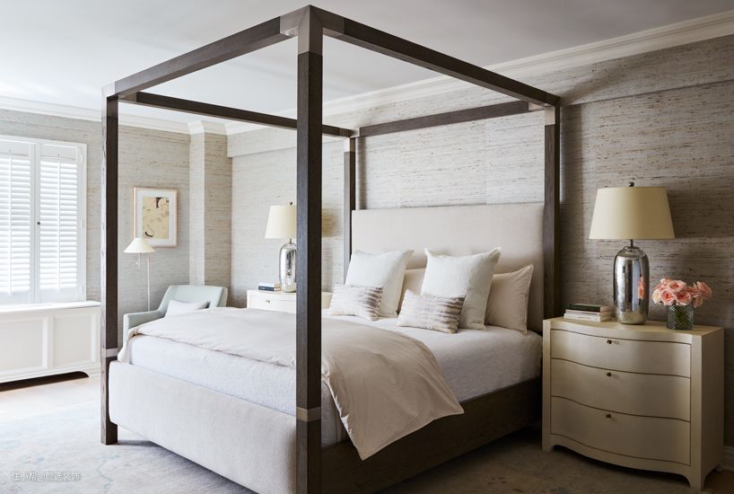 主卧空间以米白色为主调,加入床围更有传统布局的感觉,两边对称的床头柜放上精致的台灯。靠墙设置化妆桌满足女主人的使用需求。