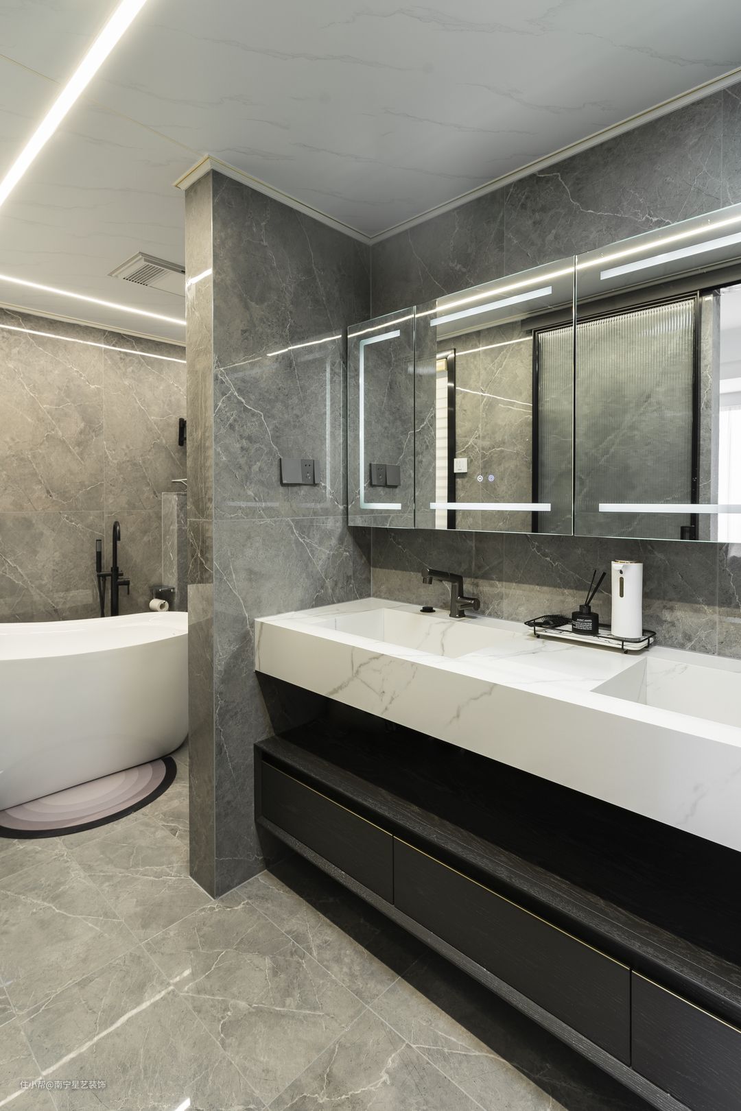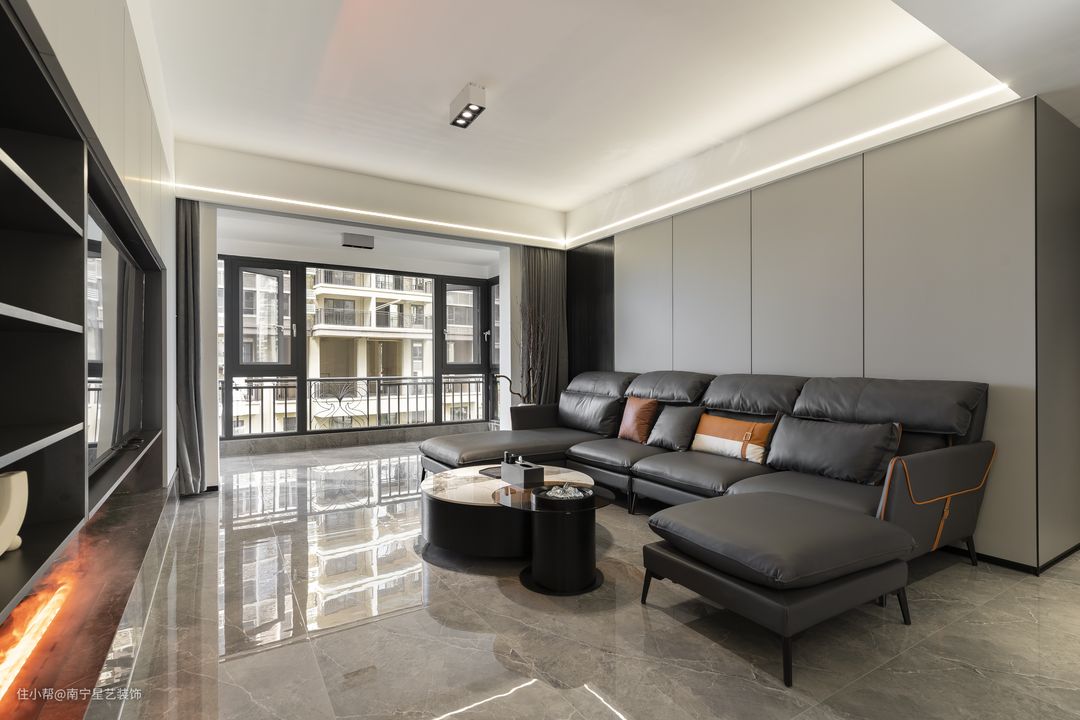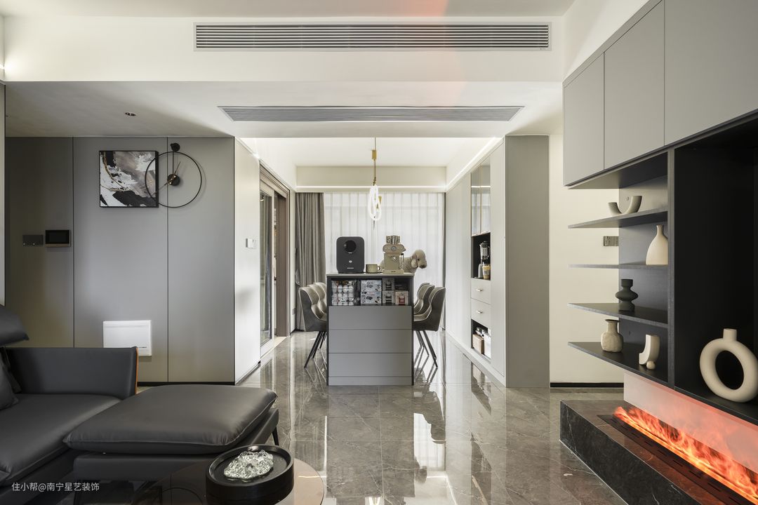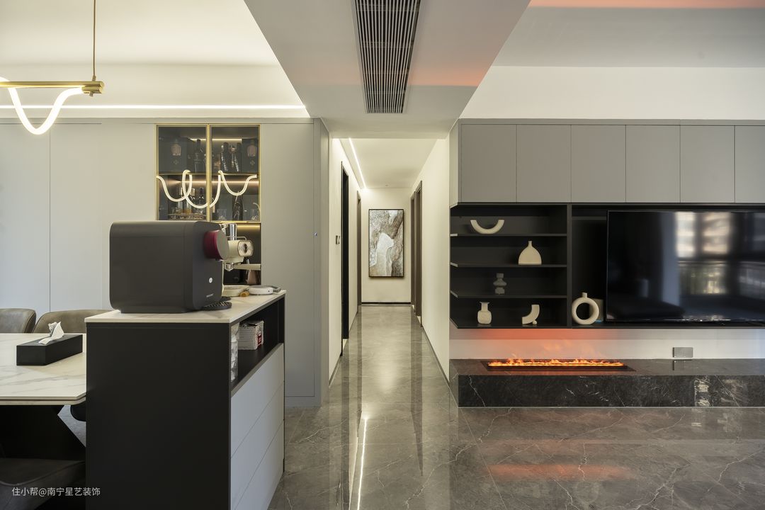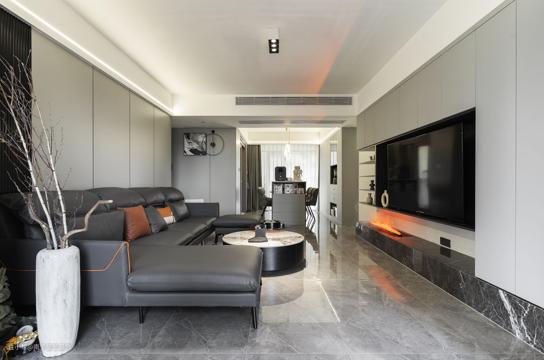 ▼改造后的样子 天花不做吊顶,而是在边檐做半圈线灯,中央做三筒射灯保证主要区域的照明;客厅墙面做浅灰色金属墙板,电视机背景墙使用同样风格做一套橱柜,使用与格调都非常完美。