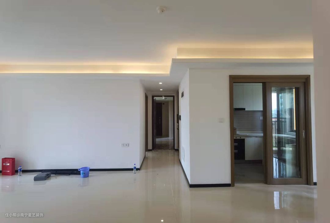 ▼客厅原貌 原本的房子不做天花,在天花沿着墙边做灯槽,隐灯的设计咋一看还不错,但是开槽太大容易藏污纳垢,业主也很不喜欢,并且计划做中央空调,天花是要重新设计的。