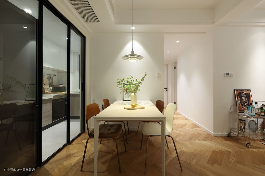 餐厅紧靠厨房与客厅隔一条过道,流动性强,主灯与筒灯的光线搭配,既能不影响正常用餐,也为用餐氛围制造出一些情调和浪漫。