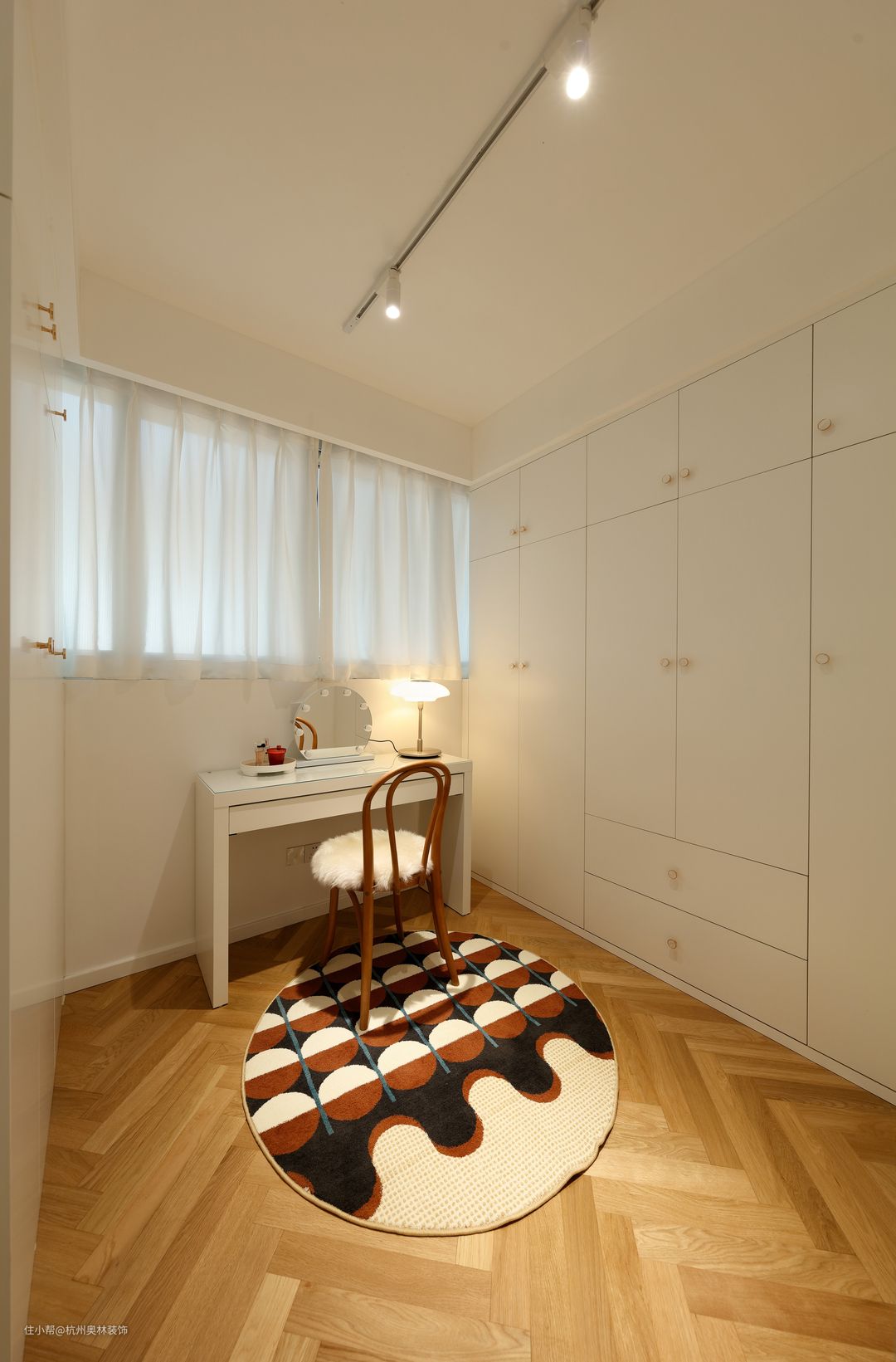 主卧把原二房改成套房,小房间直接变成衣帽间,卧室区干净清爽,衣帽间也简单有空间。