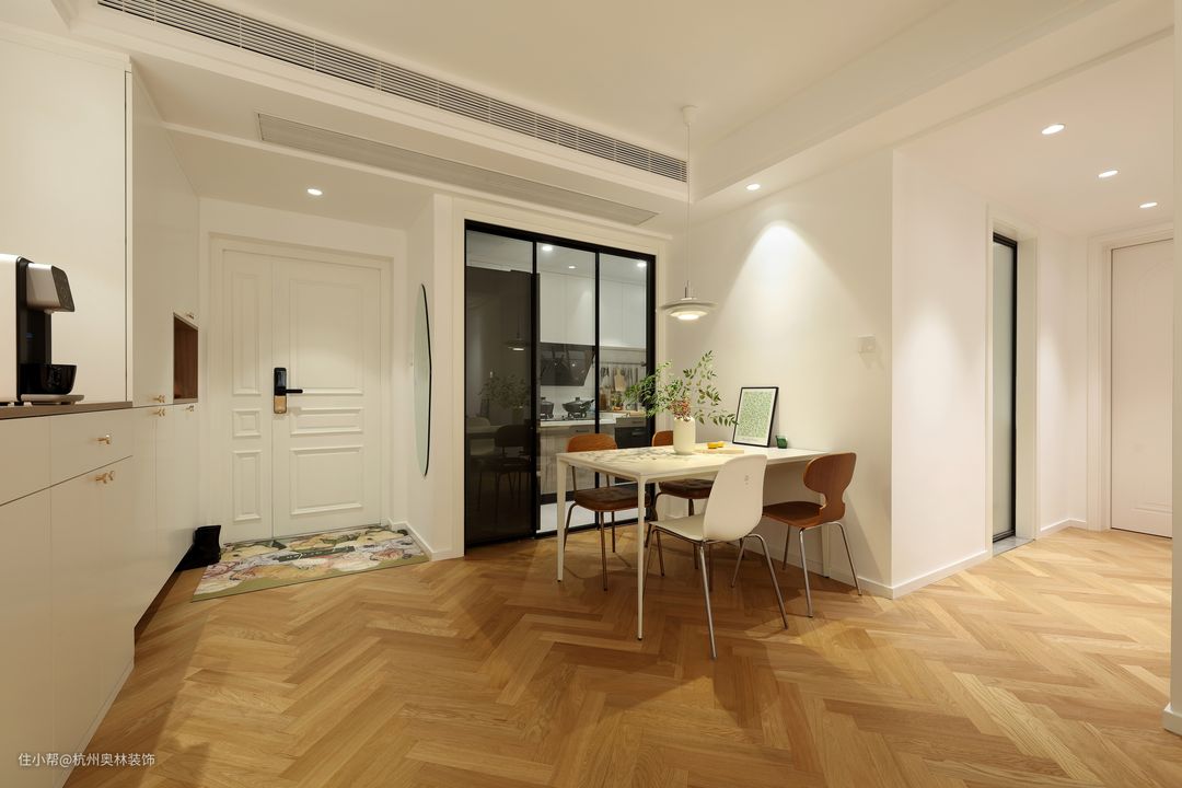 玄关柜延伸至餐厅,不仅有了餐边柜,在平面和色彩上还做到了和谐统一。