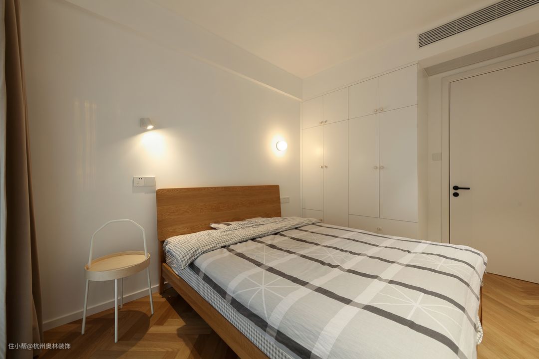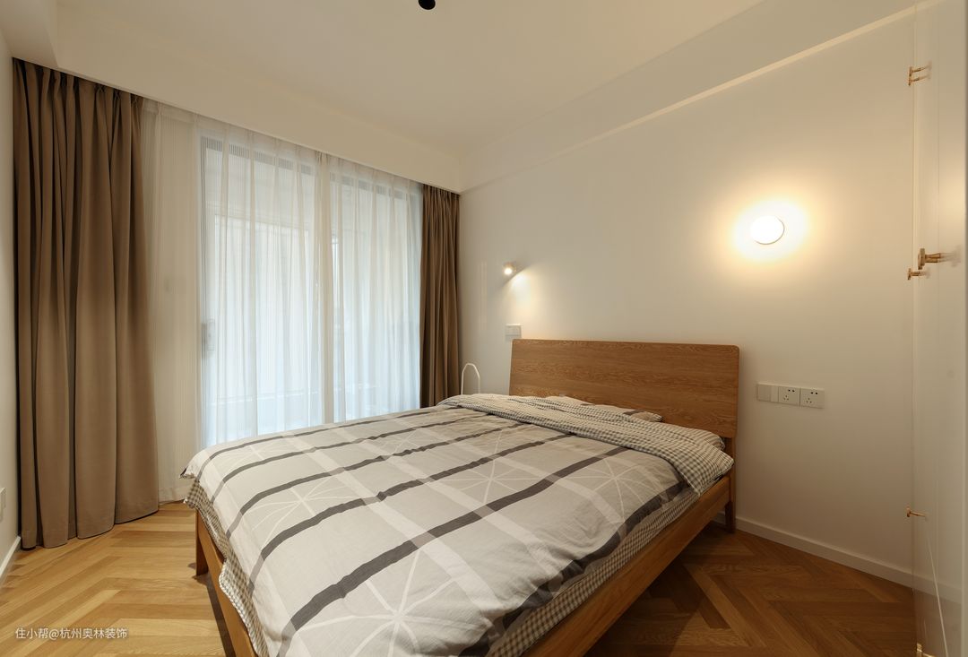 次卧是简单干净的装饰,壁灯与地板和床,都是原木的暖色。