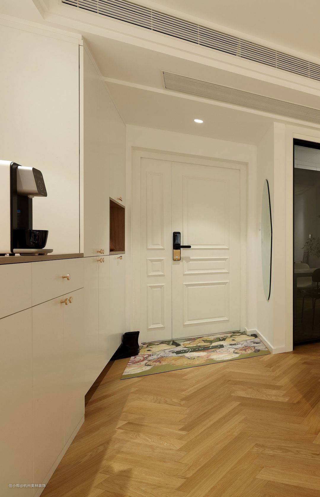 进门右侧做了玄关柜,中间镂空放钥匙包包。柜子上移15CM放鞋,整个空间干净又整洁。出门右侧放穿衣镜,放大空间的同时,每次美丽出门。