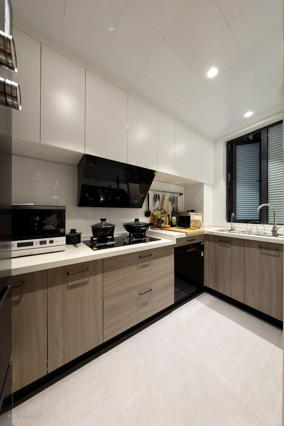 厨房空间不大,每一件物品都井然有序,空间干净整洁,生活过的特别精致。采用无主灯设计极大的避免光线盲点,在使用厨房时候操作不当。