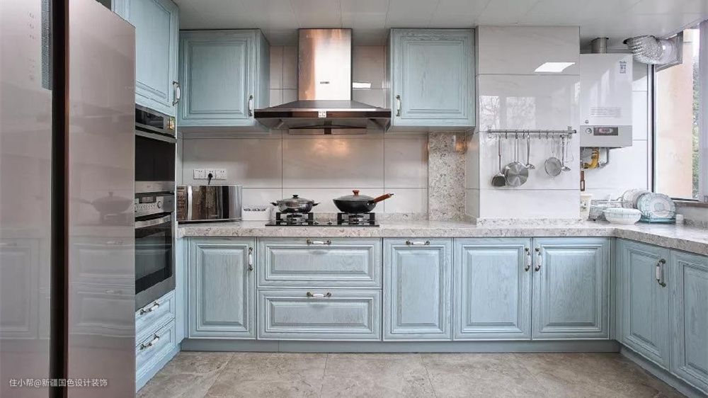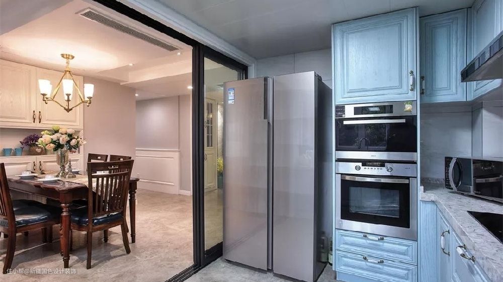 设计好的厨房有9.3㎡,把原来的北阳台框进了厨房,橱柜采用蓝色的实木柜门和浅色系的石英石台面。墙面采用仿爵士白的墙砖,亮面方便打理;厨房推拉门敞开式设计与餐厅联通一体。