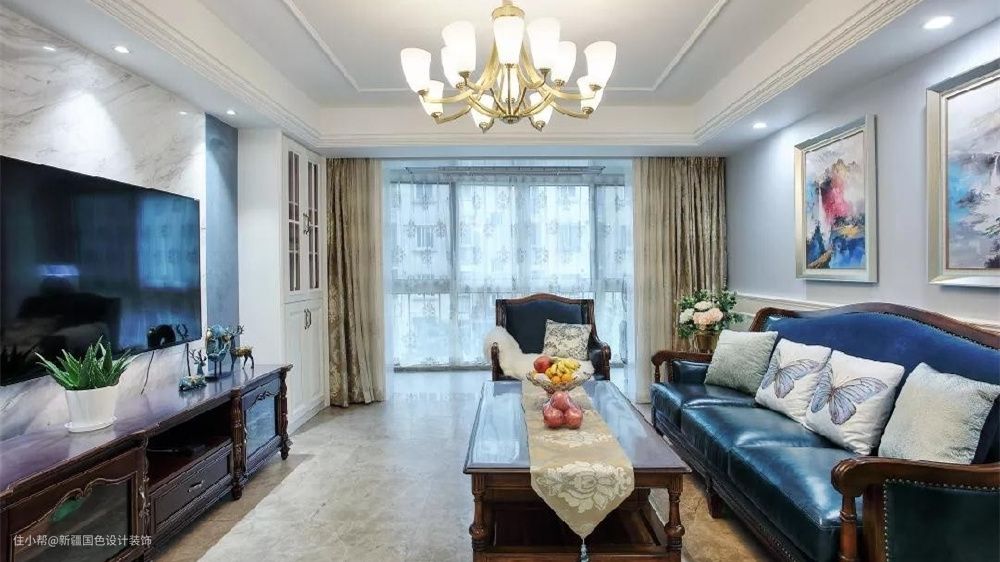 客厅里电视背景墙两边各有一列柜子,中间使用白色大理石和蓝灰色绒面硬包,既增加了了储物功能,视觉上也美观;因为是地暖房,瓷砖的导热性比较好,也有更好的耐磨性,所以选择铺地砖;沙发后面以白色实木护墙板为主,上方是淡蓝色墙面,看上去简洁舒服。