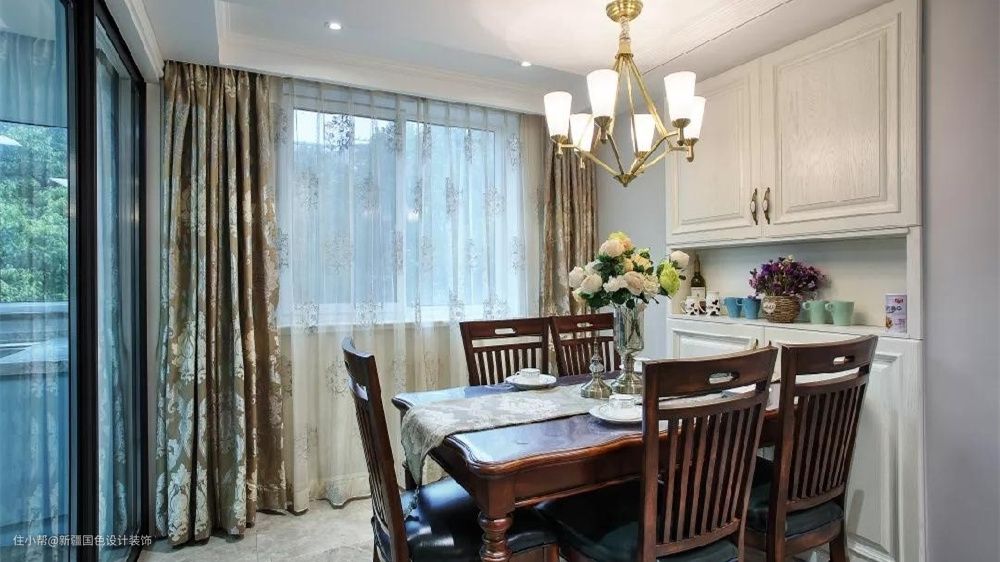 餐厅位于客厅北面,紧邻厨房,利用墙体的厚度做了内嵌式的餐边柜,达到节省空间的目的,白色护墙板的设计和柜门相呼应。