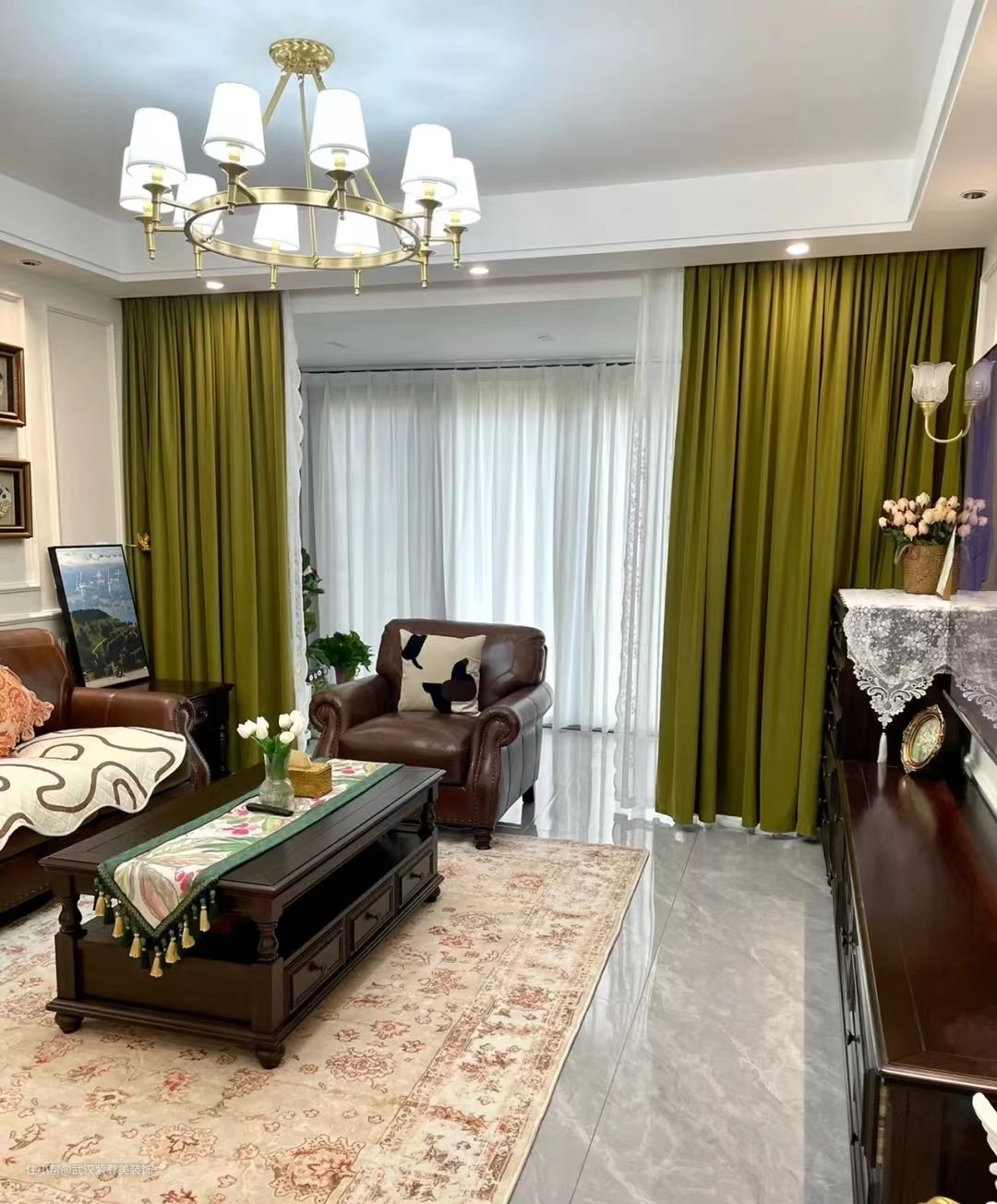 沙发背景墙用石膏线条设计简单的造型,凸显层次感,还有美式古典韵味的装饰画,古典的壁灯,美式皮质家具都凸显精致典雅的生活方式。