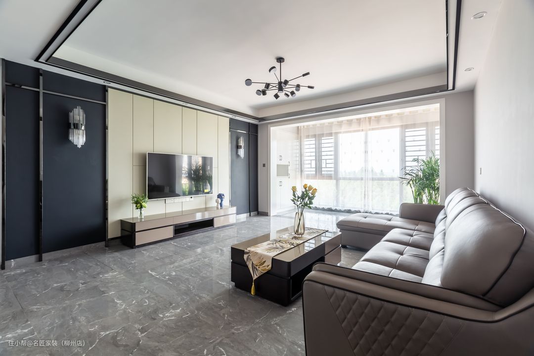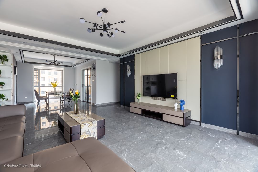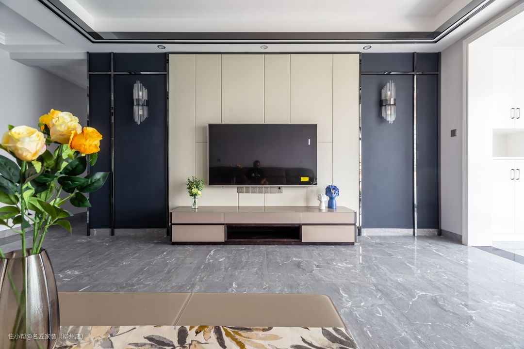 简洁的电视背景墙 由深蓝色和米白色相互映衬 并以深灰色不锈钢条镶嵌 线与面的交错 呈现出丰富的视觉层次