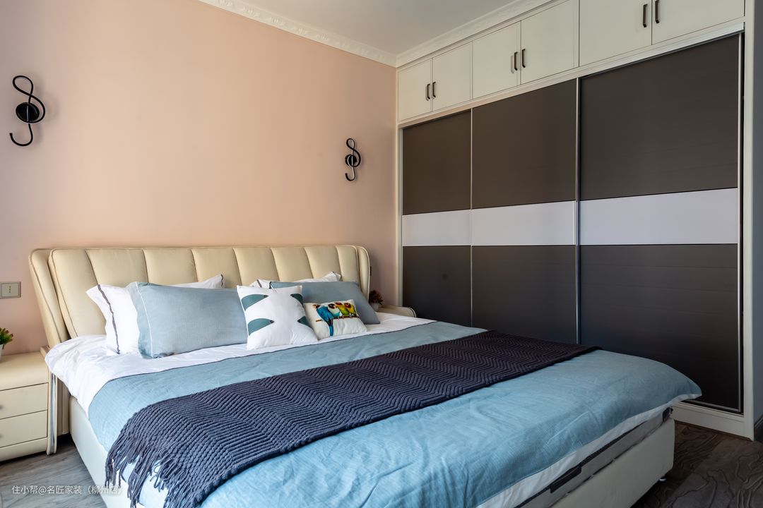 卧室的墙面以柔粉为打底 五线谱音乐符号的灯饰点缀其中 使空间也充满着节奏的韵律 米白色软靠大床 与柜体色泽相呼应 柔软的布艺清新自然 给主人温馨的睡眠体验