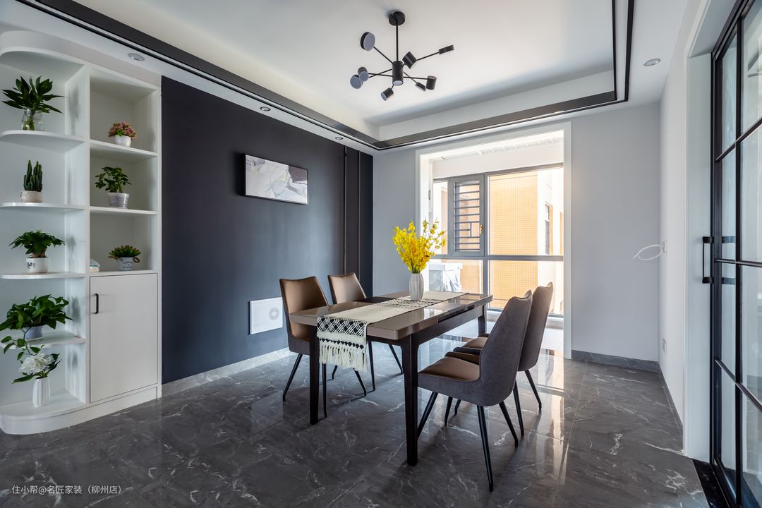 客餐厅顶面线条勾勒与整墙深色涂刷相呼应 白色弧形转角展示柜给居室增加实用功能 餐厅与阳台空间连贯通透 明亮开敞间的便利交流 承载家人间的情感连接
