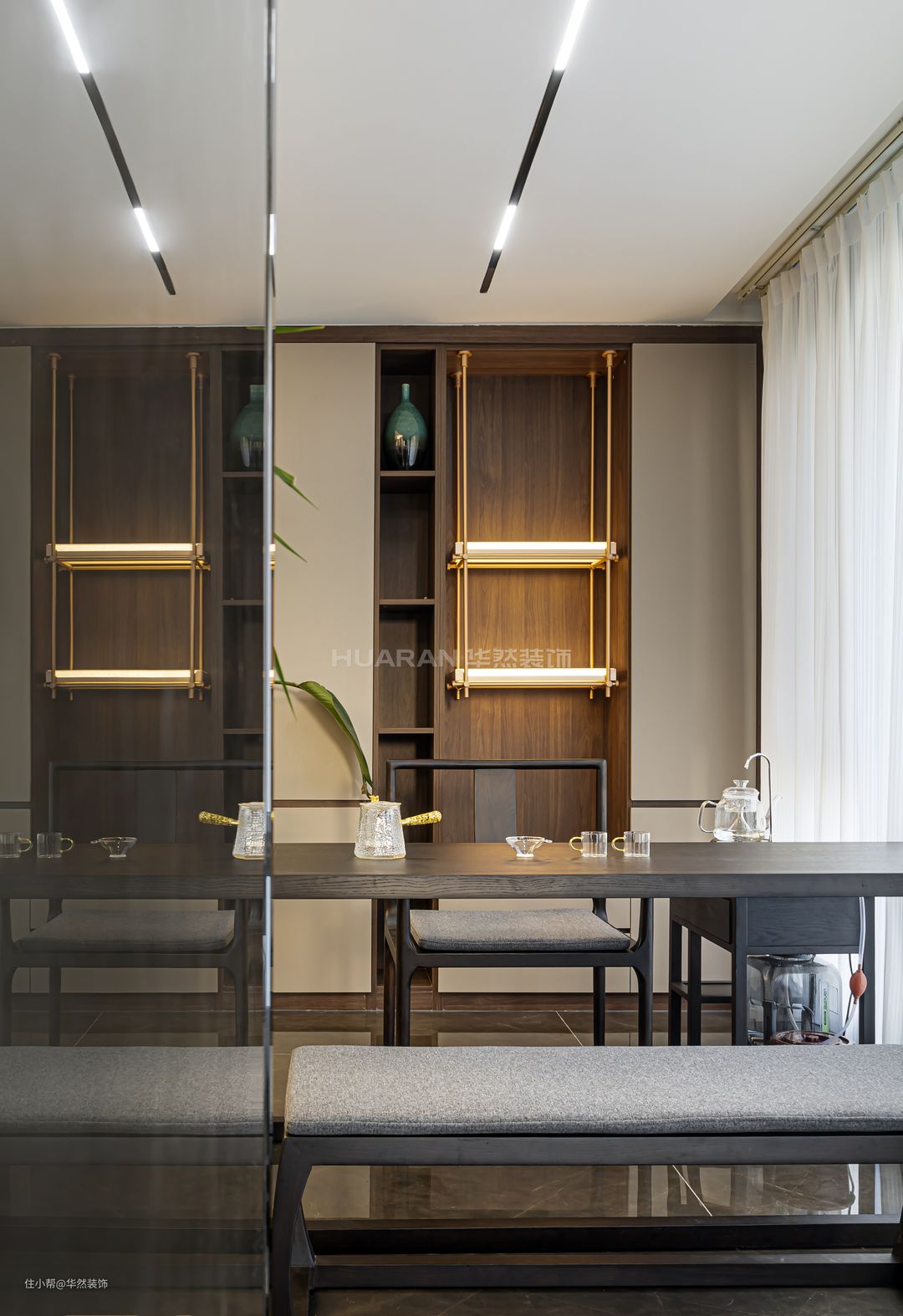 阳台区域规划了品茗赏景处,端景墙设置了木质开放格,固定的金属架上以层板灯作为吸睛的点缀区,静谧悠然。