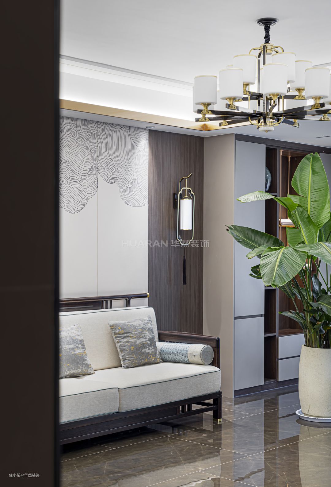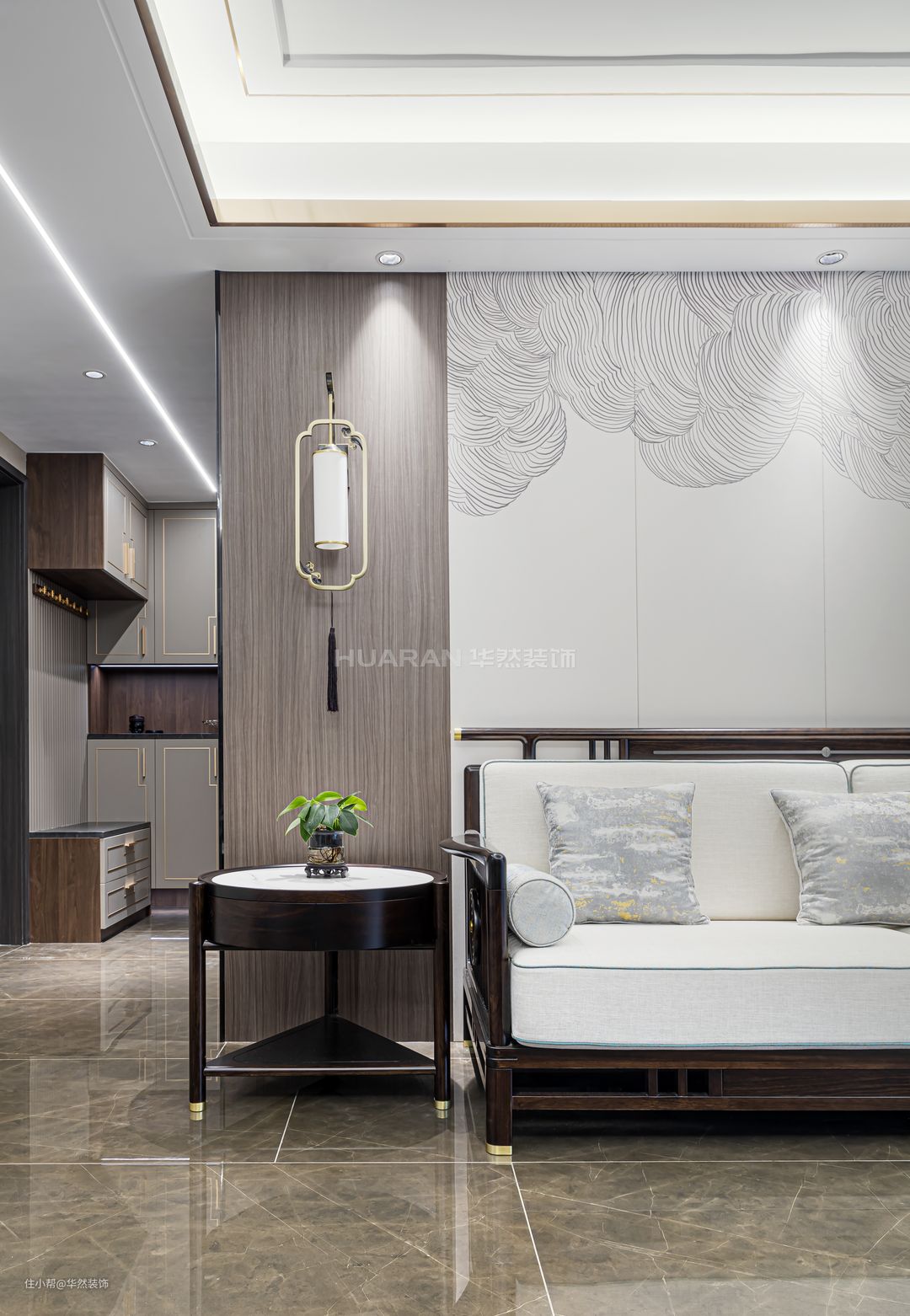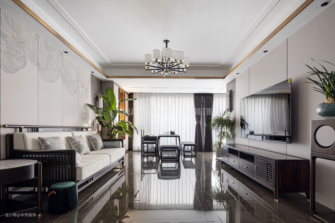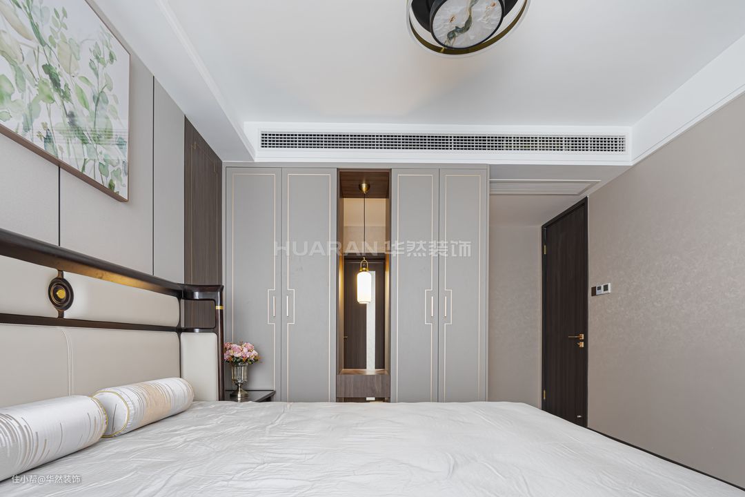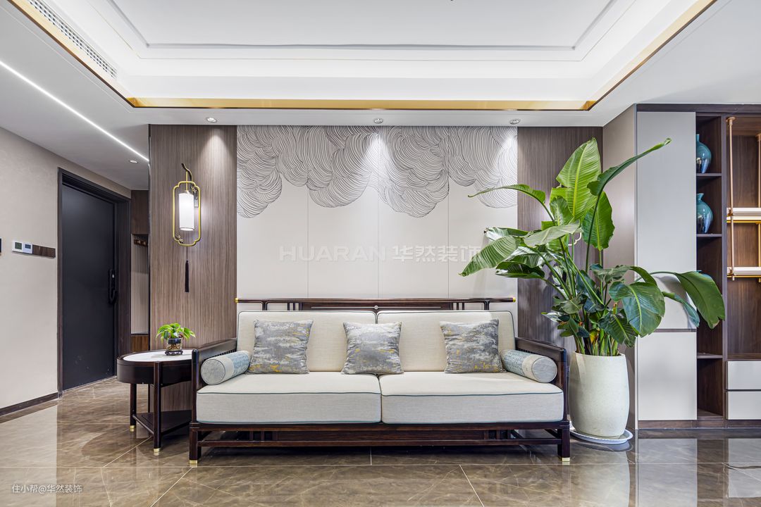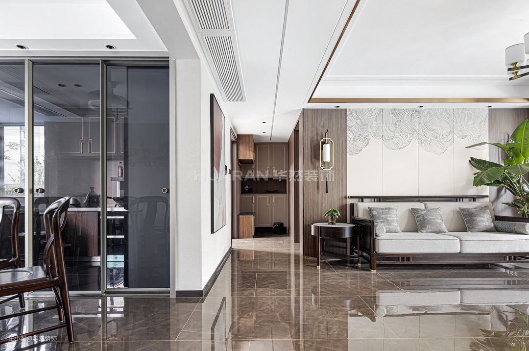 【前言】 新中式将内敛婉约的古韵融入至现代家居生活中,打造出典雅大方的风格,淡然地散发出高级感。 本案例业主为人处世低调稳重,喜欢具有底蕴的质感和格调,正适合于新中式的温润高雅。 项目地址:蚌埠 沁雅·大成天下 项目户型:四室两厅两卫双阳台 项目面积:138 m²(建筑面积) 项目风格:新中式 装修费用:基础装修:8万 软装&家具:9万 电器:6万 作品名称:《銮·镜》 设计施工:华然装饰集团 【客户需求】 1.希望居住的环境是高端恬静的,在端庄沉稳的风格里传递格调和品质。但是整体布局设计也要考虑到当下的生活状态,避免僵硬呆板。 2.业主夫妻有两个儿子,需要合理规划好生活区域,使得动线流畅。原户型布局不需要做太大的改动,只需要完善调整客餐厅与厨房的空间。 【设计解析】 1.全屋以米色、深咖与黑檀进行调和配色,同时通过色彩与材质的碰撞,体现古典与现代的交叉融合。 2.将南阳台纳入客厅,延伸空间,开阔视野;北阳台的空间被释放给餐厅,设置了西厨操作台;半开放的厨房格局与餐厅空间连接过渡,让烹饪备餐更方便。 3.让简单日常的生活不乏乐趣与兴致,考虑到业主有品茗放松的爱好,在客厅设置了古色古香的茶水台,感受传统饮茶风韵。