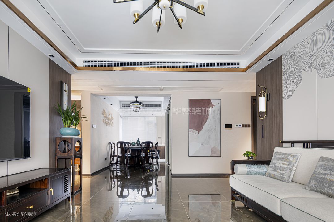 回字型吊顶很适配新中式的风格。“四周矮中间高”的落差可以将中央空调通风口设置的隐蔽一些,同时也拉高了空间层次,而金色镶边的修饰则凸显精致大气风范。