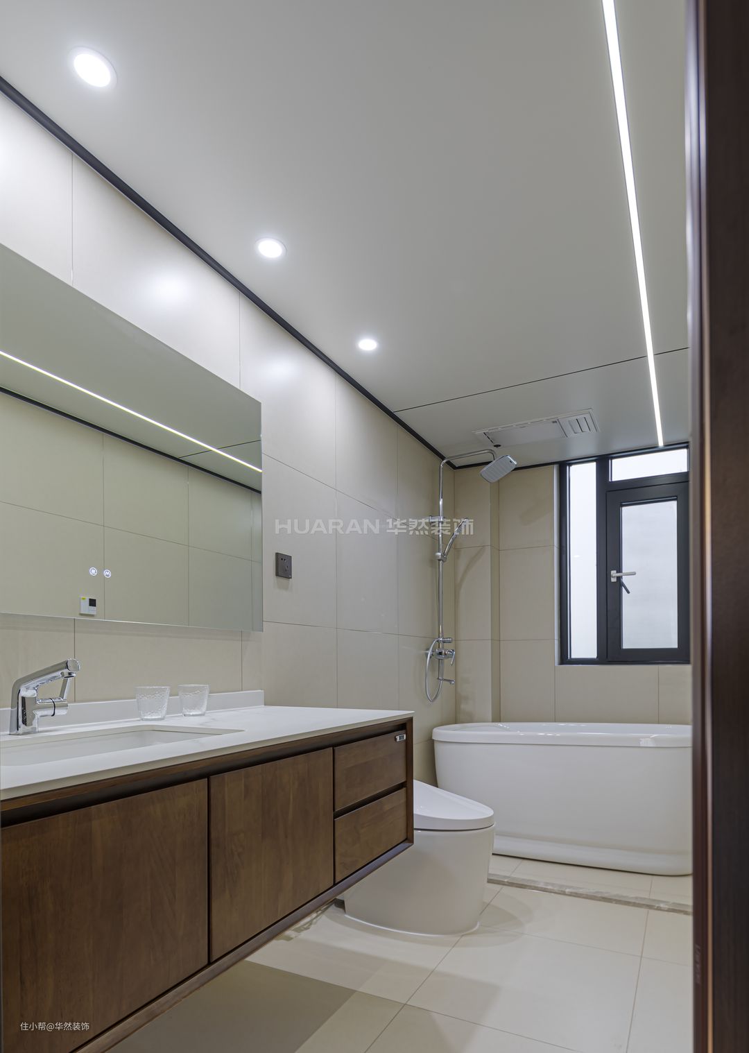 卫浴简洁明朗,智能浴镜可调节灯光亮度,悬浮式浴室柜可以使日常清洁更方便,人性化的设置更贴心。