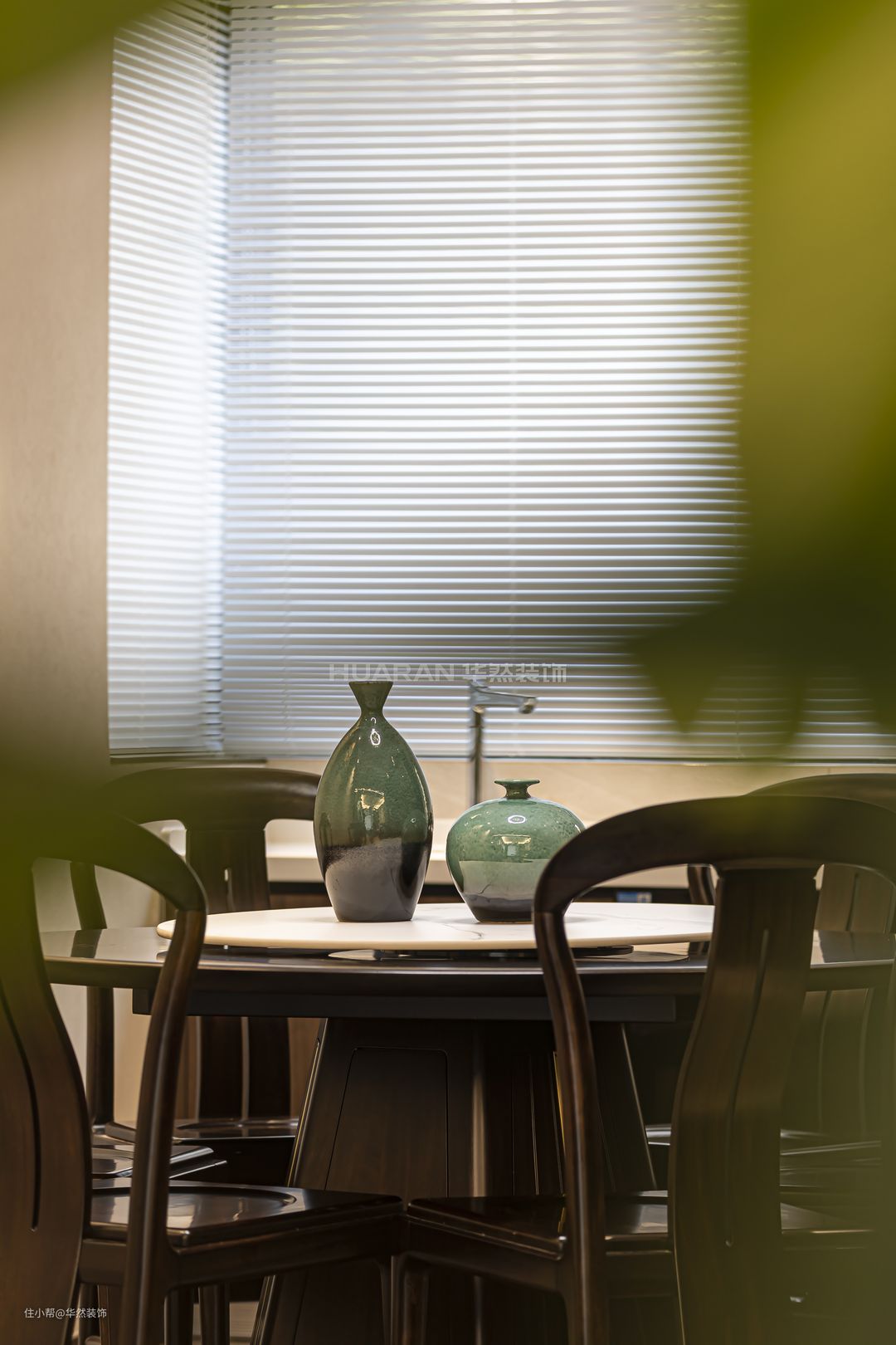 餐桌椅采用深棕色实木材质,圆形餐桌庄重大气,符合中式用餐的仪式感。餐椅靠背造型采用富有古典形态的曲线设计,呈现自然舒展的雅致。