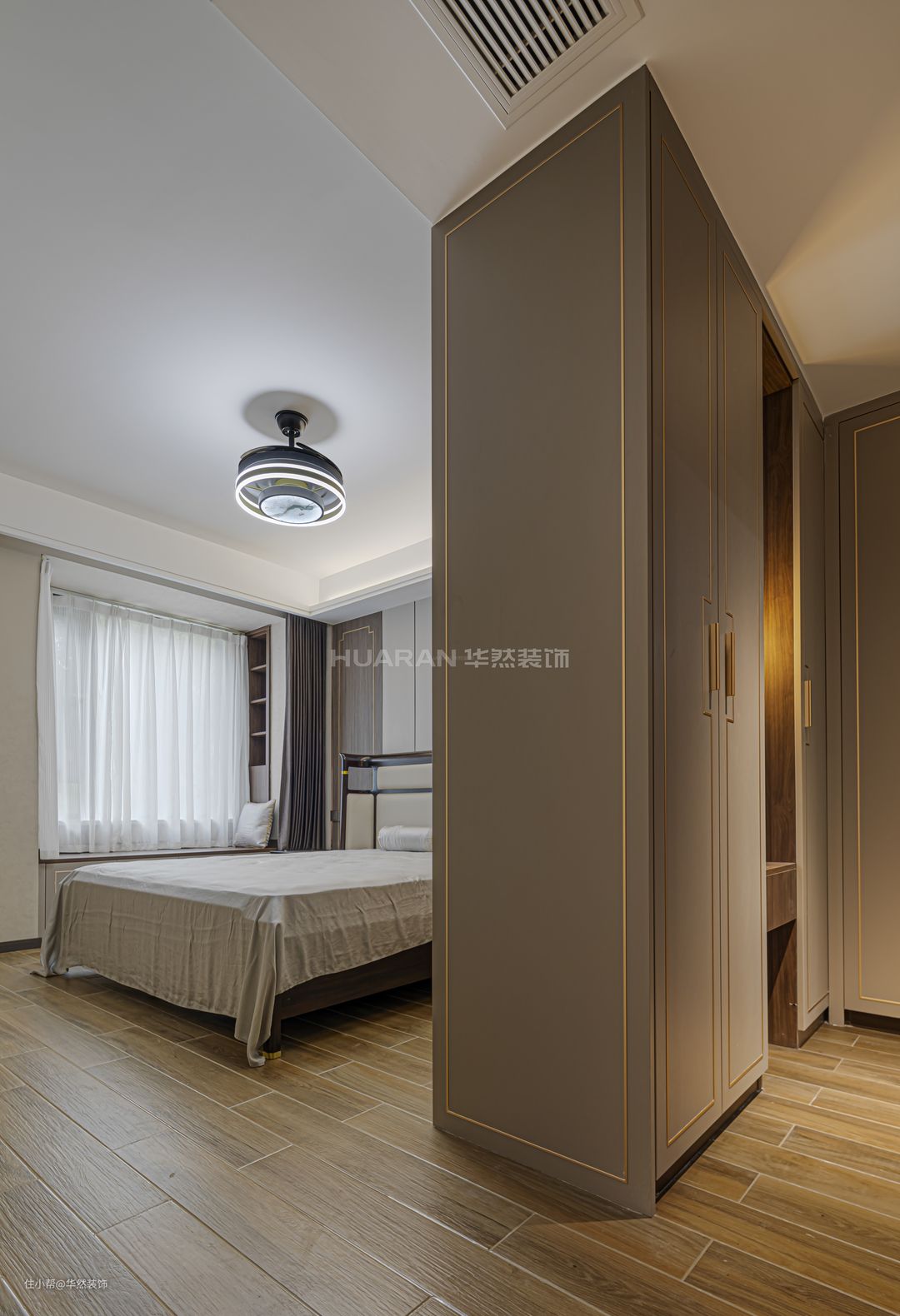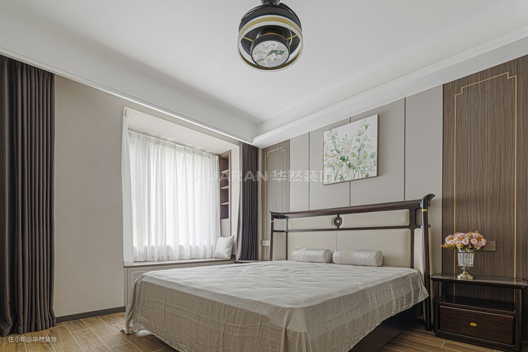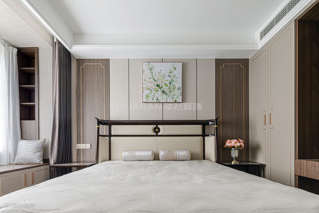 主卧端庄典雅,低饱和度的色调让空间沉静安然,提供舒适的睡眠氛围。飘窗侧边设置了壁龛,方便日常收纳或放置小物件。