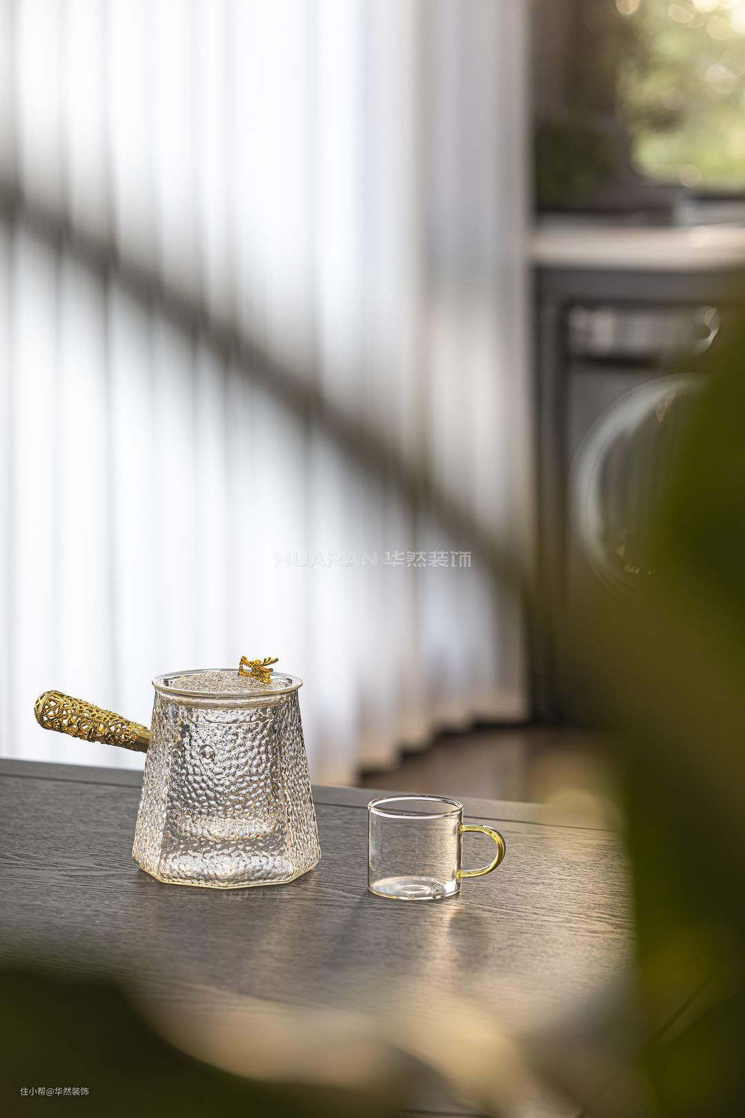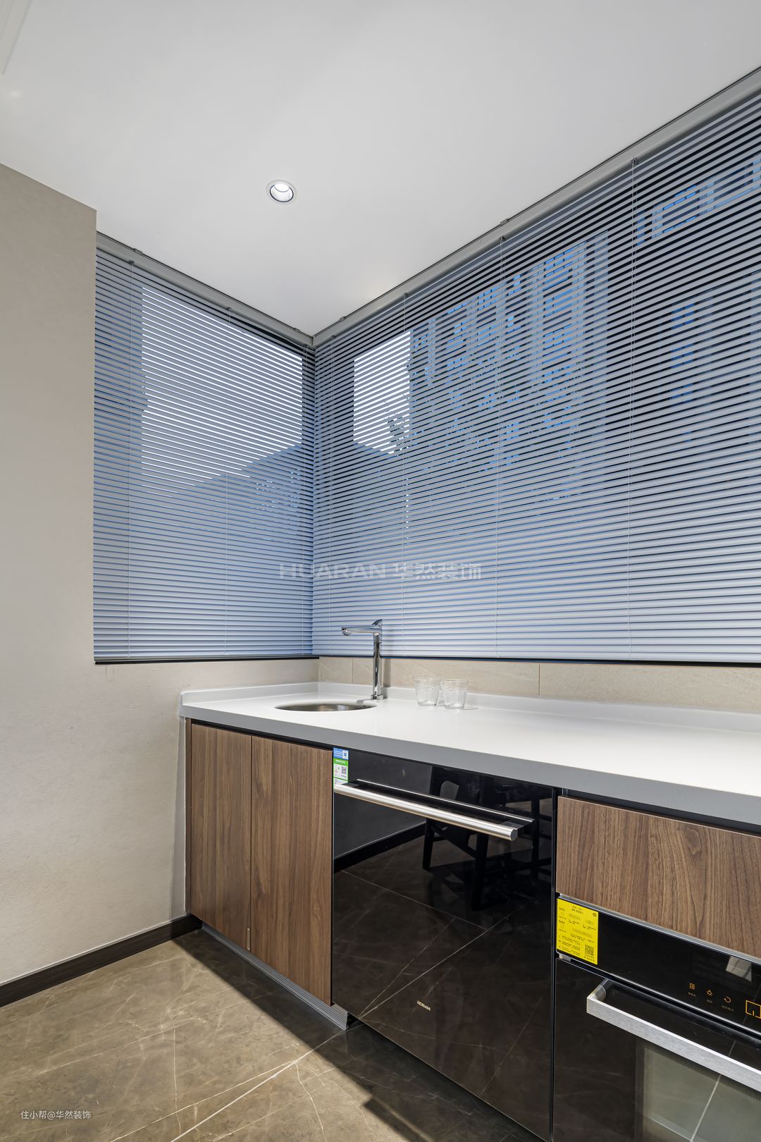 西厨将电器与收纳柜结合一体,简洁利落。百叶帘轻盈灵动,自由调节光线,可以兼顾隐私性与采光度。