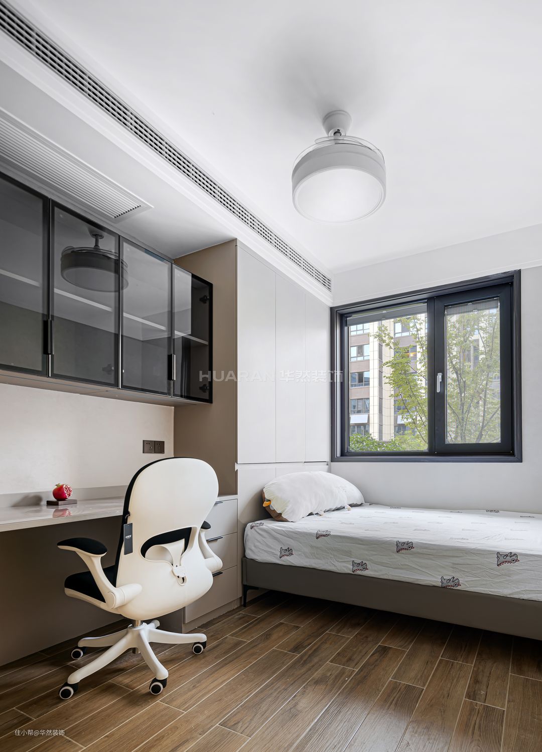考虑到孩子年龄较小,所以将卧室设置的更简单实用,减少过多繁杂事物的干扰。 床头处的衣柜以无把手的形式避免日常碰撞,更加安全。书桌由衣柜延伸而来,一体式设计兼具床头柜功能。学习椅贴合儿童脊背曲线,提供舒适的感受。 吊柜以黑色玻璃柜门保证通透和美观性,可以放置足够多的东西,也不显得杂乱。