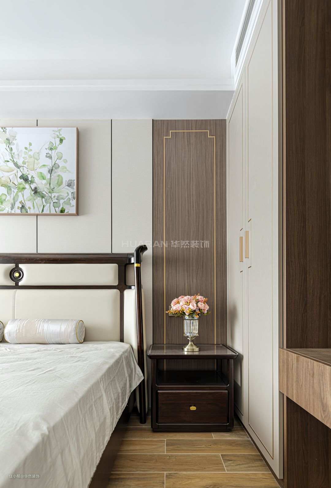 深棕木质床头柜雅致耐看,隔层与抽屉双重设计凸显层次感。