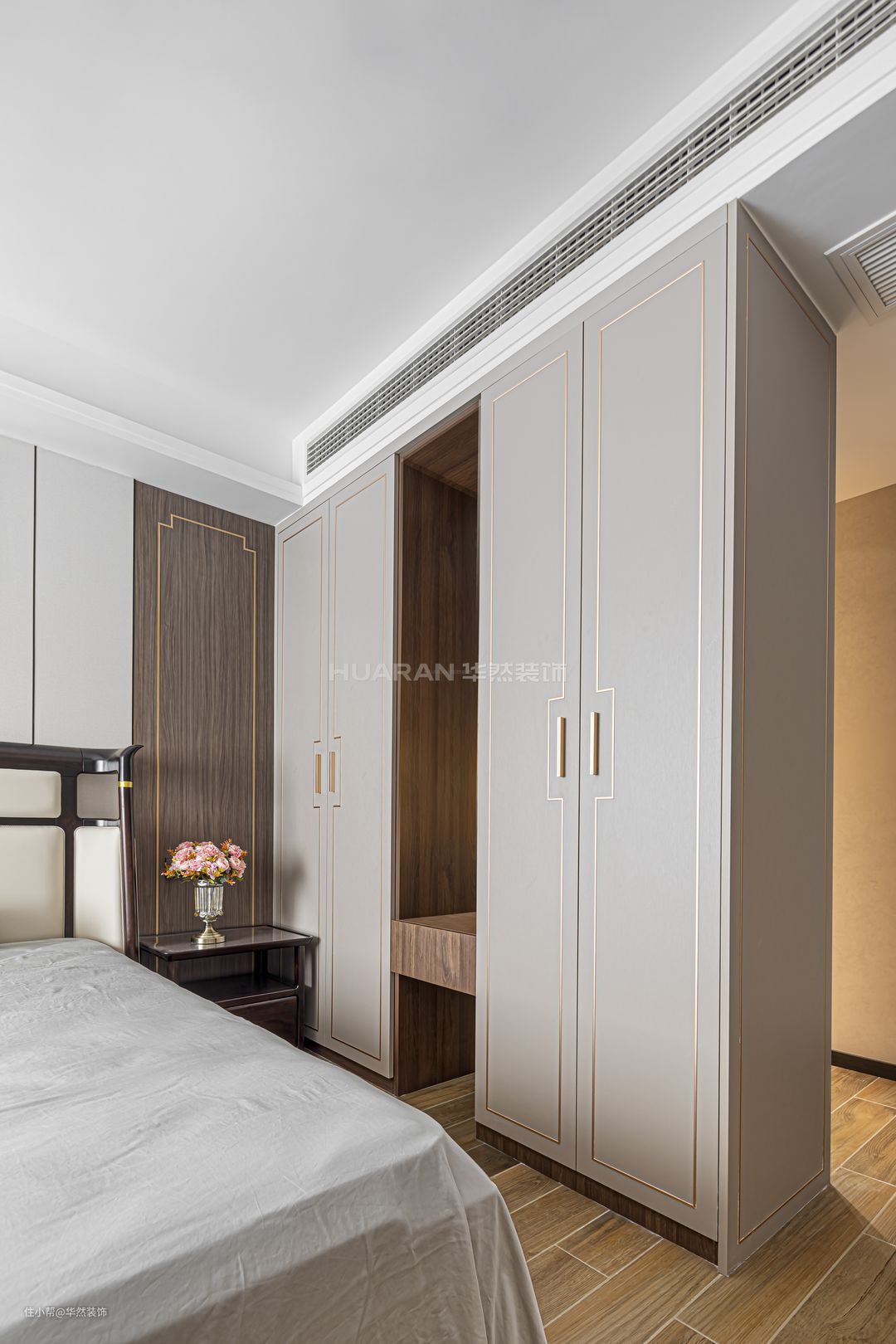 L型转角衣柜以镂空的隔断让空间穿而不透,吊灯晕染温馨的氛围。