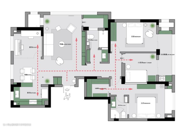 原户型的弊端 1、没有入户玄关,缺乏与室内的过渡 2、空间划分不合理,每一个区域都被分割的较小,特别是客厅和餐厅两个主要的活动区域 3、双阳台与双衣帽间占据过多的室内面积造成空间浪费 4、主卫阴暗封闭,缺乏采光