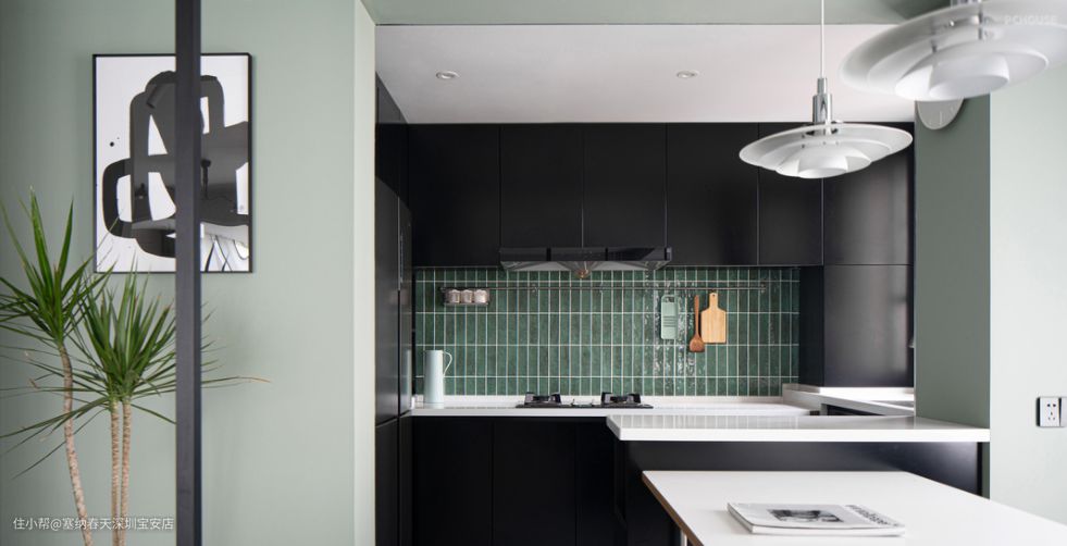 橱柜设计在保证足够收纳的同时兼顾美观,吊柜呈L形