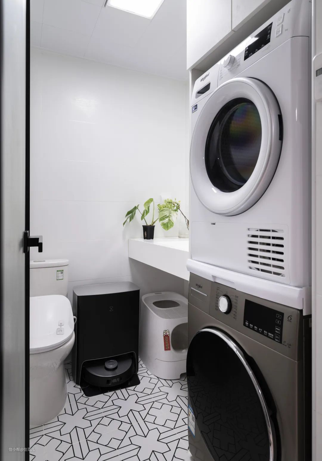 洗衣机和烘干机被安排在次卫中,上边安装到顶的储物柜,就近收纳洗衣用品。 另外,考虑到有存放扫地机器人、猫砂盆的需求,屋主夫妇将洗漱台高度定在了 90cm。