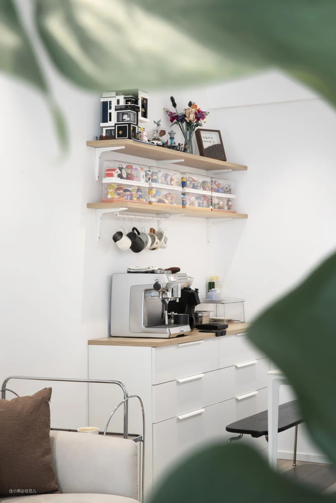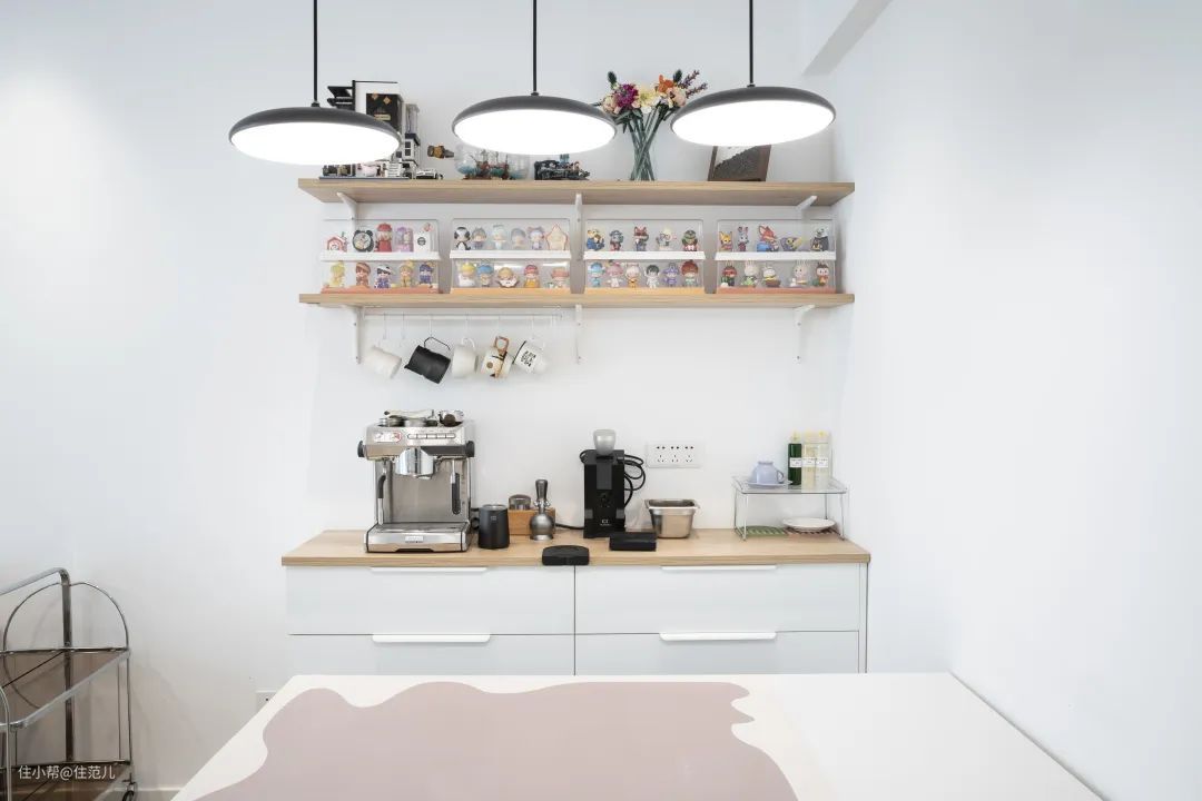史先生和太太都喜欢喝咖啡,因此专门在餐桌后边设计了宽 160cm、深 40cm 的餐边柜,存放咖啡机及相关的器具。