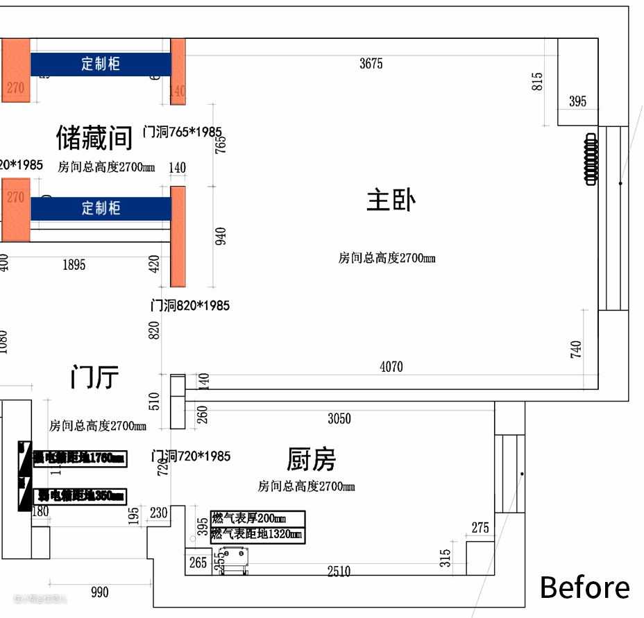 住范儿设计师刘杨杨和两位屋主沟通后,对房子做了 4 处改动: ● 将原厨房隔墙从一字形变为 Z 字形,两边分别能塞下进深 61cm 的定制柜; ● 储藏间不再与主卫、卧室相连,内部储物空间得以扩大; ● 确认隔墙可拆除后,次卧门洞向左挪 50cm,右侧新建门垛以布置通顶柜; ● 阳台被纳入次卧,变为化妆区。